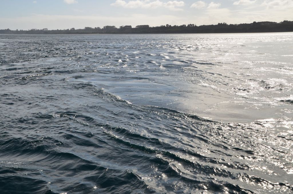 An dieser Stelle wurde schon mehrfach davon berichtet, dass den Gezeiten und damit einhergehenden Strömungen eine nicht zu unterschätzende Bedeutung bei der Törnplanung in den chilenischen Kanälen zukommt. In dieser Hinsicht nun haben wir uns das Beste für den Schluss aufgehoben: Canal Chacao. Dieser trennt die Nordseite der Isla de Chiloé vom chilenischen Festland. Die Gezeiten strömen hier mit 4-9 Knoten durch. „Slack“, also das Stillwasser, im Zuge dessen sich die Strömung umkehrt, dauert nur wenige Minuten. Steht der teils kräftig kanalisierte (oft West-)Wind gegen den rasanten (ablaufenden) Strom entsteht eine konfuse Welle. Immer wieder finden sich auf der Seekarte die Zeichen für „Wasserturbulenzen“. Ganz offensichtlich brauchen wir auf dem Weg vom Golfo de Ancud zum Pazifik also Ebbe und ruhiges Wetter. Und wir haben Glück.