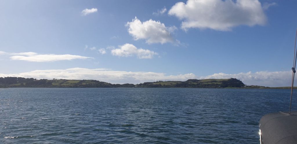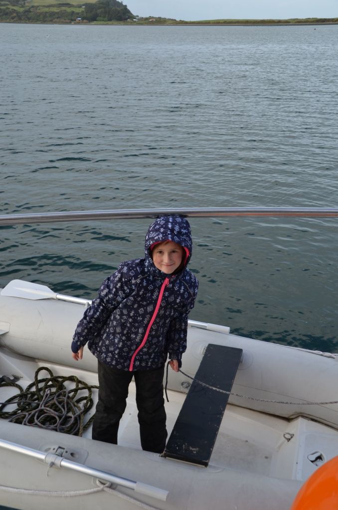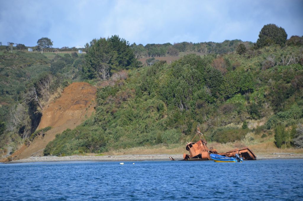Wir haben gerade den Ankerplatz abgefahren, da funkt uns schon wieder die Armada an. Anscheinend haben die Kollegen unscharfe Vorstellungen von den Möglichkeiten einer ständigen Funkwache bei kleiner Familiencrew. Wir können die Störung kurz halten und schließen das Ankermanöver kurz danach ab. Noch ist es schön und einige Zeit hell, so dass wir den Abend für einen kleinen Strandspaziergang der Landzunge Punta Larga nutzen. Traurig aber wahr, hier am letzten Ankerplatz, setzen wir zum ersten (und letzten) Mal einen Fuß auf die Isla Chiloé.