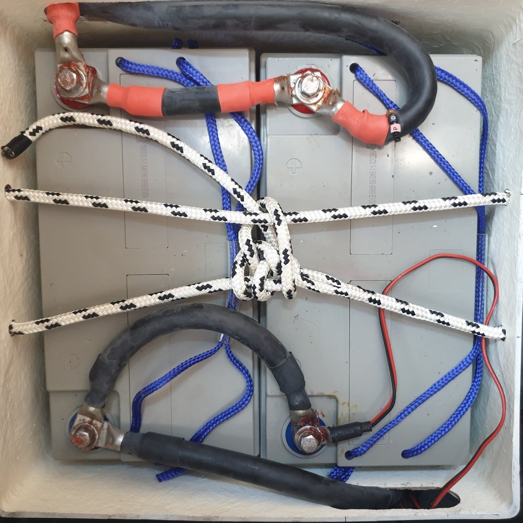 Und dann ist da ja noch die Starterbatterie. Diese muss – im Gegensatz zu den Verbrauchern – zum Motorstart kurze Zeit hohe Leistung bringen. Darum ist das auch eine andere Art von Batterie und von den Verbrauchern getrennt. Die normalen Stromabnehmer sollen die Starterbatterie nicht belasten und damit jederzeit einen problemlosen Motorstart sicher stellen. Aber warum zeigt der Batteriemonitor dann unter Last mit Inverter auch einen signifikanten Spannungsabfall eben dieser eigentlich getrennten Starterbatterie an. Sehr suspekt. Mehr noch… morgens war nicht nur die Spannung der Verbraucher-, sondern auch dieser Starterbatterie runter. Mehr als einmal reichte es nicht mal mehr aus, um den Motor zu starten. Nur gut, dass wir Überbrückungskabel an Bord haben. Irgendwann wurde es zu unserer normalen Routine, die Starterbatterie vor Anker schlichtweg abzuklemmen. Das half tatsächlich. Vor der Abfahrt wieder angeklemmt, startete der Motor fortan hinreichend zuverlässig.
