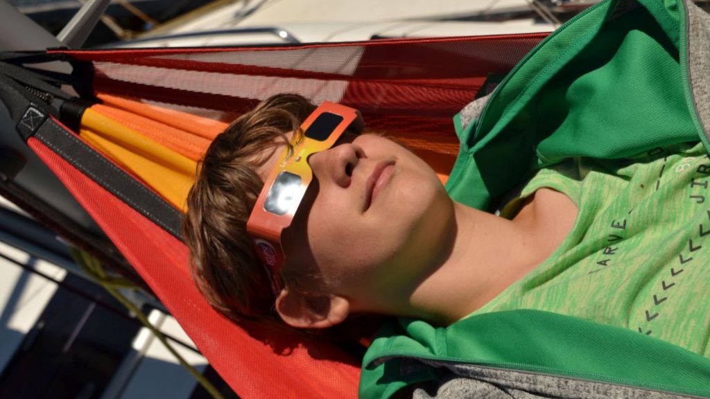 Am Vorabend hat es geregnet. In der Nacht hat es geregnet. Am Morgen hat es geregnet. Grau in grau. Doch dann, kurz vor zwölf Uhr, kurz nachdem der Mond anfängt sich vor die Sonne zu schieben, zeigen sich erste blaue Lücken am Himmel. Schnell die vom Honorarkonsul besorgten Brillen aufgesetzt und tatsächlich… da knabbert oben links etwas an der Sonnenscheibe. Es klart sich tatsächlich weiter auf. Was für ein Glück! In Windeseile baut Samuel unsere Hängematte auf. Schließlich möchten die Kinder bequem genießen.