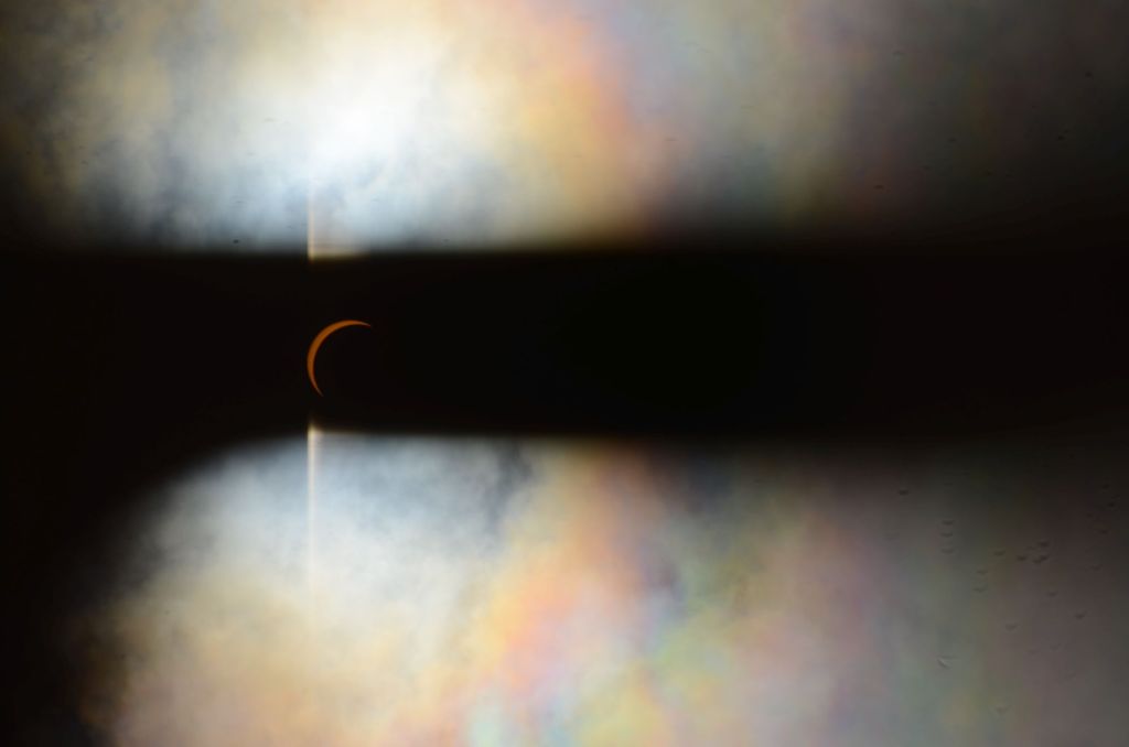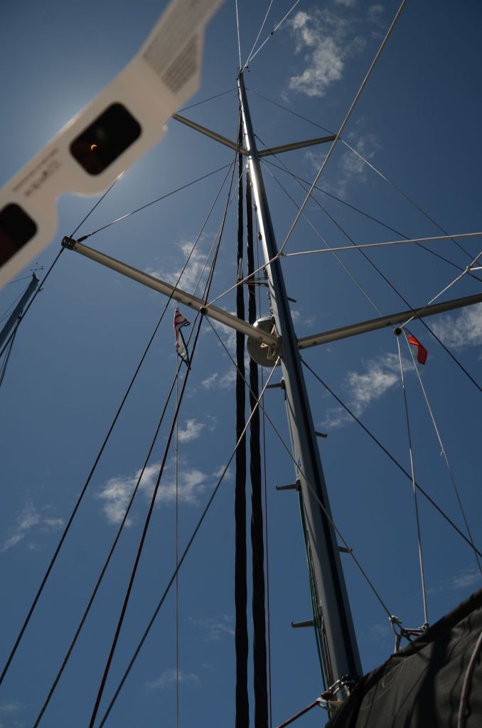 Langsam verändert sich das Licht. Es wird etwas dunkler und doch ist es anders, als wenn sich einfach nur Wolken davorschieben würden. Es ist eine ganz besondere Stimmung, die uns umgibt. Irgendwann beginnt sogar die Untiefentonne in Sichtweite zu blinken. Kurz nach ein Uhr ist das Maximum erreicht. Der Mond geht durch und lässt nur einen kleinen Rand frei. Merklich kühler ist es inzwischen natürlich auch geworden.