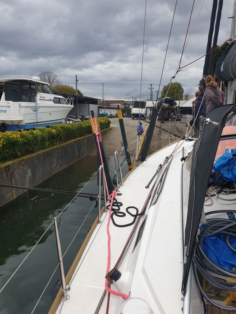 In Südamerika geht man das Thema eher pragmatisch an. In Brasilien wurde ein Karren ins Wasser gelassen, ein Hafenmitarbeiter ging hinterher und sorgte für sicheren Halt bevor ein Traktor das ganze Gespann raus zog. Hier in Valdivia ist es nicht sehr viel anders. Ok, kein Traktor. Aber letztlich ist es dann doch ein recht einfacher Karren. Vorab wurden nach unseren Angaben ein paar Holzblöcke darauf festgenagelt, auf denen unsere Samai (hoffentlich) sicher aufliegen kann. Dann wird dieser Karren ins Wasser gelassen und das Boot, je nach Tiefgang bevorzugt bei Hochwasser, zwischen die Metallstreben buchsiert. Von der Seite schaut ein Hafenmitarbeiter, ob das passt. Das Wasser ist so flach, dass er das problemlos erkennen kann. Die Leinen fest, also richtig fest, und dann geht es los. Der Karren wird rausgezogen. Das Boot kommt mit. Wir oben drauf. Irgendwann sitzen wir auf und es geht weiter raus. Ein echt komisches Gefühl, doch es funktioniert. Warum auch nicht, schließlich ist das Procedere hier lang erprobt.