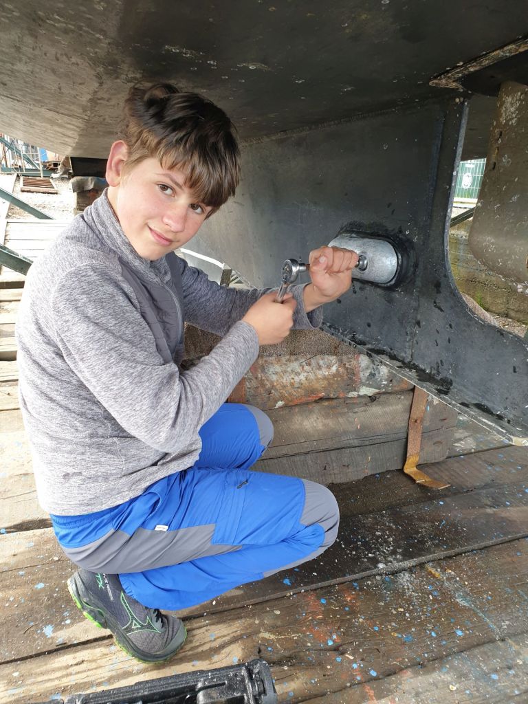 Wir wollten den Landurlaub unserer Samai möglichst kurz halten und machten uns wann immer es halbwegs trocken war ans Werk. Zunächst wurden alle Opferanoden erneuert. Die zwei kleinen am Bugstrahlruder waren echt nervig, die drei großen dagegen am Rumpf fast schon Routine. Samuel war eine gute Hilfe. Schließlich haben wir Jungs dann auch dem Propeller neue Anoden sowie eine gründlich Schmierung gegönnt. Dieses Thema war damit abgehakt.