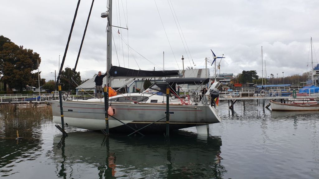 Eigentlich wollten wir ob der Windvorhersage erst einen Tag später rausgeholt werden. Doch der Zeitplan ist eng, die Warteliste lang. So verbrachten wir einen ersten unruhigen Abend. Ja, im Gegensatz zu anderen Ländern kann die Besatzung hier selbstverständlich auch dann im Boot bleiben, wenn dieses an Land steht. In Deutschland würde jede Versicherung in unkontrollierten Kreisen laufen. Wir dagegen „genossen“ auf dem Trockenen seitlich Böen von bis über 40kn. In einem mindestens 12t schweren Schiff, das in einem nur bedingt vertrauenswürdig anmutenden Karren stand. Doch der Schein trügt, alles gut!