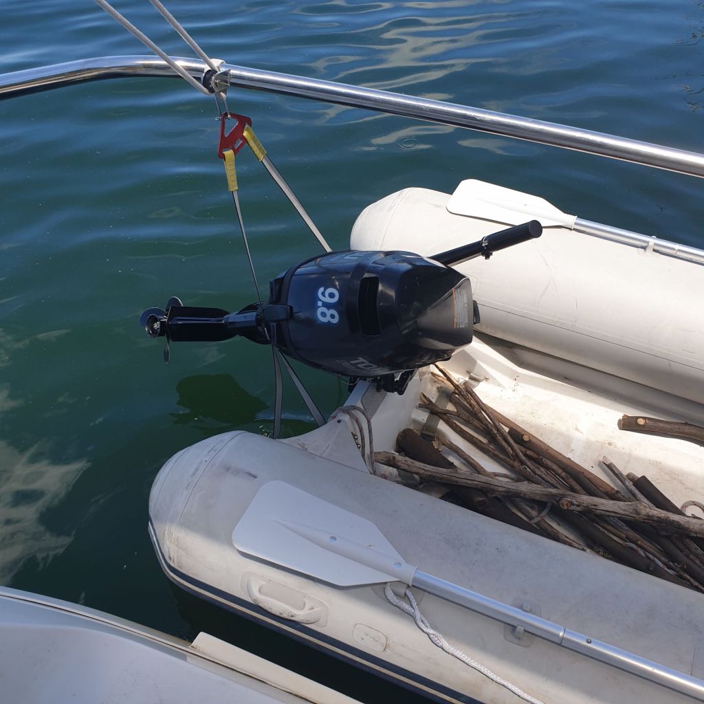 Wie fast alle Boote ab einer gewissen Größe hat auch unsere Samai ein kleineres Beiboot. Über die Schreibweise kann man streiten, ich habe mich jetzt mal mit „Dinghy“ angefreundet. Dieses Dinghy hat natürlich Ruder. Damit kann man unkompliziert kleinere Strecken zurücklegen. Beim Ausbringen der Landleinen reicht das völlig aus. Für längere Strecken nimmt man aber doch lieber die Hilfe eines Außenbordmotors in Anspruch. Wir hatten uns damals für einen Tohatsu 9.8 entschieden. Ja, er ist mit seinen knapp 10PS zugegebener Maßen kein Leichtgewicht, aber letztlich ein recht guter Kompromiss zwischen Handhabbarkeit und Leistung.