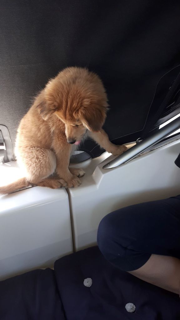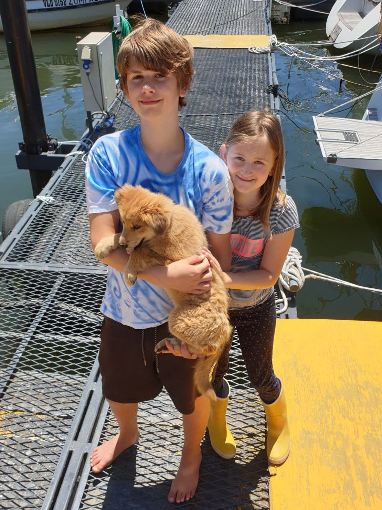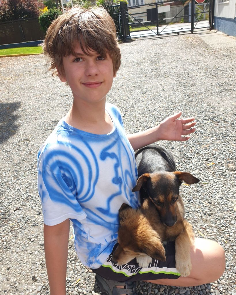 Maila und ich wollten eines Tages wieder zu den beiden Hunden und sahen drei! Ein Hund war hinzugekommen. Er war noch jung und sehr flauschig. Sein Name ist Dimon. Er ist neugierig und knabbert gerne irgendwo dran. Ich konnte Dimon aber problemlos auf den Arm nehmen. Dort tut er auch absolut nichts außer herumliegen. Später kommt Dimon tatsächlich auch zu uns wenn er uns sieht. Und gerade an dem Tag, wo wir zu Loki (einem anderen Hund, den wir schon kannten) wollten, kommt Dimon mit zum Steg. Wir konnten ihn leider nicht mitnehmen, sodass er winselnd vor unserm Boot stehen blieb.