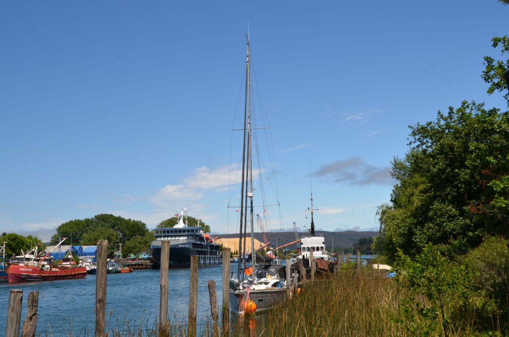 Dann ging Valdivia in Phase 1 = Quarantäne. Da endlich fassten wir den Entschluss, der unglaublichen Einladung zu folgen. Ja, es war Quarantäne und Bootsverkehr damit offiziell nicht erlaubt. Aber was sollte uns ohnehin offiziell nicht in diesem Land Anwesenden schon passieren. Am 11. November fuhren wir also die halbe Meile nach Süden und schauten nach dem beschriebenen Liegeplatz. Er war nicht schwer zu finden. Ein Mann winkte schon, bereit unsere Leinen anzunehmen. Kurz danach begrüßte uns Inselherrin Patricia am Steg. Wenig später hatte sie die halb deutschstämmigen und -sprachigen Nachbarskinder (Vater aus Greifswald) vom Festland abgeholt und sogleich wurden auch unsere zwei Kinder zu einem Streifzug über die Insel eingesammelt. Doch davon erzählt Maila das nächste Mal ausführlicher.