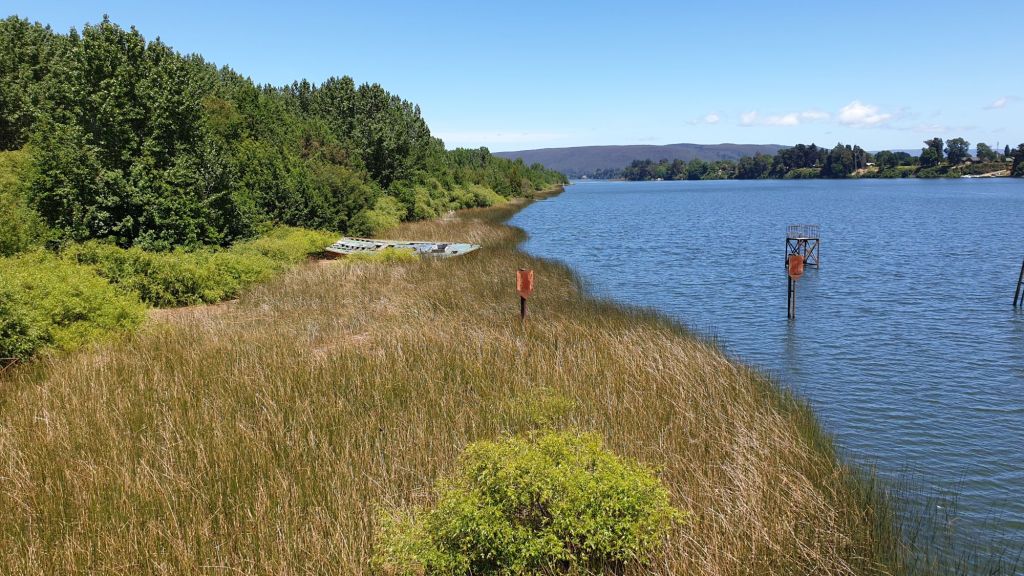 Auf einem unserer Inselstreifzüge besuchen wir auch den großen, am Ufer vor sich hin rostenden Rohbau eines Katamarans. Da hatte sich mal ein Chilene Schiffspläne aus Argentinien besorgt und den Bau angefangen. Dann stellte man fest, dass das falsche Material verwendet wurde… Eisen statt Aluminium. Das Boot war statisch so nicht brauchbar, eine Korrektur zu teuer. Also schob man es einfach auf die Küste. Die Eigentümer der Insel dürfen es nicht bewegen, der Eigentümer des Wracks versteckt sich selbst vor Kaufangeboten. So bleibt der Status quo. Im Grund ein Schandfleck für Valdivia. Andererseits ein Paradebeispiel für die allgemeine Problemlösungsstrategie offizieller Stellen in Chile, welche wir gerade am eigenen Leib erfahren.