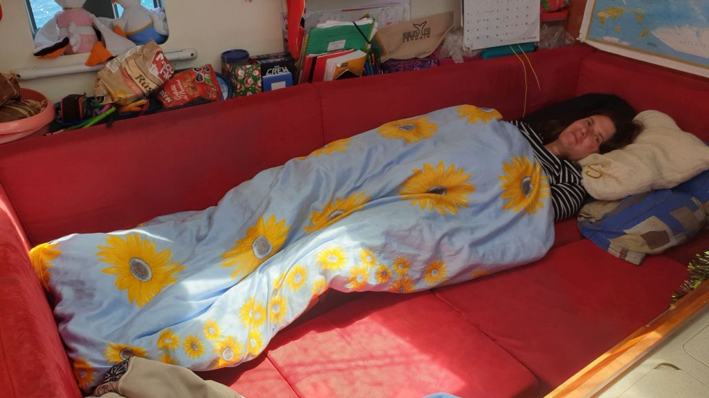 Eben diesen Tag verbringen wir dann eigentlich recht typisch für den Beginn eines mehrtägigen Törns. Zumindest, wenn es kein Kaffesegeln ist. Samuel liegt fast den ganzen Tag in seine Decke gemummelt im Cockpit und hört ein Hörbuch. Unter Deck wird ihm später pünktlich zum Essen flau. Er stürmt hoch, haut danach aber trotzdem ordentlich rein. Die Jungs essen oben. Maila sitzt am Tag auch stundenlang draußen, schaut auf die Wellen und erlebt Abenteuer ihrer Gedankenwelt. Das kann durchaus anstrengend sein, am Nachmittag schläft sie spontan auf der Couch ein. Gleich neben La Skipper. Die Arme gibt sich ganztägig den zweifelhaften Freuden Ihres „Segelmodus“ hin. Bevorzugt in der Horizontalen. Glücklicherweise ist es keine schwere Seekrankheit, aber anfangs helfen ihr Tee, Vomex und Ruhe am besten durch den Tag.