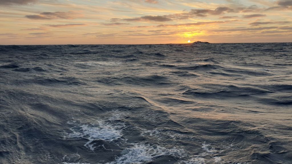 Weht es bei der gestrigen Abfahrt im Río Valdivia anfangs zwar noch kanalisiert auf die Nase, so hilft der Strom dann doch schnell auf den Pazifik. Noch in der Abdeckung ziehen wir das Groß im zweiten Reff hoch. Draußen verzweifeln wir dann erst mal wieder am Abgleich von leichter Südwindvorhersage und kräftigem Westwinderlebnis. Nicht schön, aber segelbar. Die Fock geht raus, der Motor aus, die Samai darf endlich mal wieder das tun, wofür sie letztlich gebaut wurde. Segeln! Angetrieben von pfeifendem Wind pflügt der Rumpf durch rauschende Wellen nach Nordwest Richtung Juan Fernandez. Schon kurz danach werden wir mit den Wettergurus versöhnt. Der Wind dreht schnell auf Süd und wir fliegen raumschots in den Sonnenuntergang.