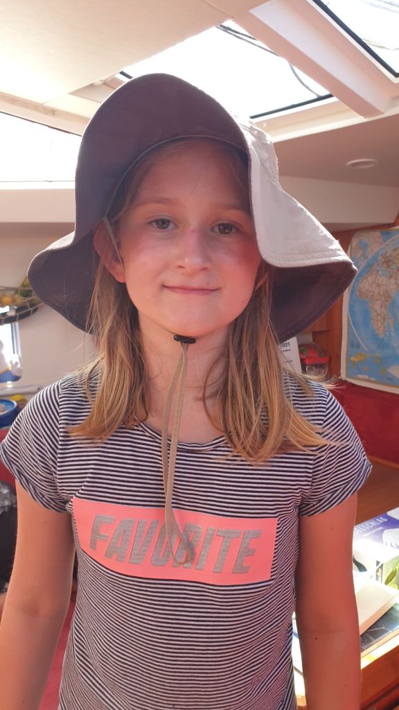 Ansonsten verläuft der Tag entspannt und ähnlich wie gestern. Na wenigstens schaut Samuel sich mal ein paar Vokabeln an und auch Maila macht zumindest etwas Schule. Erste Schritte auf dem Weg zur Bordroutine unter Segeln. Ansonsten verbringen beide wieder viel Zeit im Cockpit. Nachdem Maila sich gestern einen kleinen Sonnenbrand im Gesicht holte, hat sie nun Papas Schlapphut als modisches Schutzaccessoire entdeckt echt süß!
