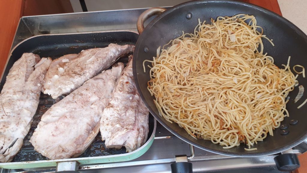 Etwas später soll das Großsegel gesetzt werden. Nur noch rasch die mit neuem Köder versehene Angel einholen. Genau dabei passiert es. Mitten beim Aufrollen erfolgt ein Biss. Kulinarische Abwechslung. Mit seinen 63cm bringt der elegante Fisch zwar nur gut 2kg auf die Waage, doch es reicht für vier große Filets zum Abendessen. Manchmal braucht es so wenig. Bei schönstem Sonnenschein, nur mit Großsegel vor dem Wind, schaukeln wir durch 3m-Schwell und genießen tja, wenn wir das nur wüssten. Ja, es war sehr lecker, aber die Bestimmung des Festmahls steht noch aus und wird nachgereicht ;-)