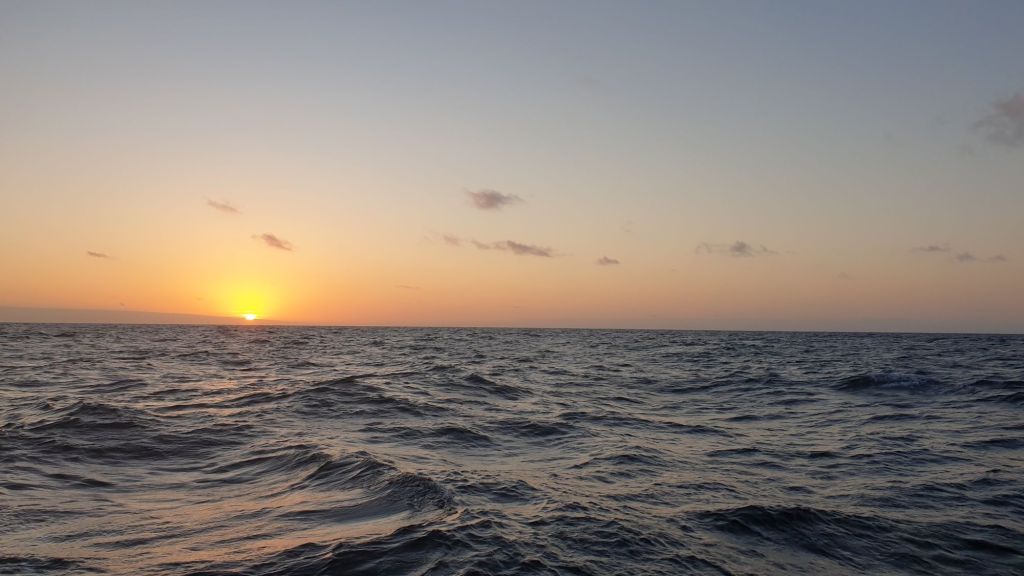 Den ganzen Tag haben wir eine gute Windstärke mehr als angesagt. Der Windgenerator dreht wild seine Kreise und wir gönnen Winnie mal eine Pause. Der elektronische Autopilot kommt unter Vollzeug einfach besser mit den Wellen klar. So machen wir ordentlich Strecke!