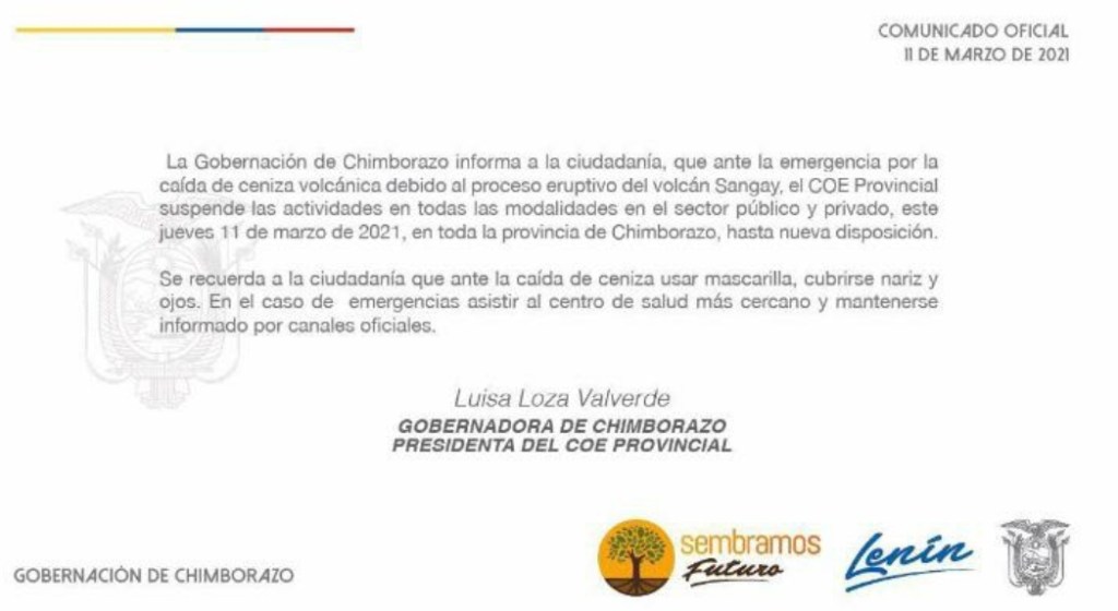 Natürlich wäre es reizvoll, dieses Naturspektakel mit eigenen Augen zu sehen. In der Tat sind nicht wenige Schaulustige unterwegs. Andererseits sind wir froh, gerade jetzt nicht dort vor Ort zu sein. Vorhin hat unser Gastgeber in der Nähe des Cotopaxi (Cuello de Luna) eine offizielle Information weitergeleitet, nach der in der auch von uns befahrenen Region Chimborazo der Notstand ausgerufen wird und damit unter anderem alle privaten und öffentlichen Aktivitäten bis auf Weiteres ausgesetzt sind. Das hätte uns wahrlich einen großen Strich durch die Planung gemacht.