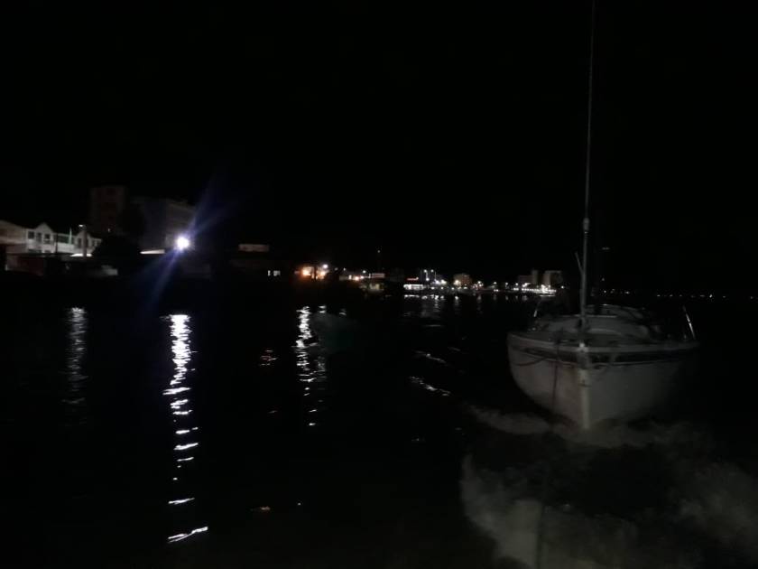 Einige Zeit später bekommen wir die Bestätigung, dass es keine geplante Aktion ist. Ein größeres Motorboot schleppt einen der Segler stromaufwärts zurück und legt ihn an einen Schwimmsteg. Nach und nach kommen auch die anderen Ausreißer wieder in Sicht. Letzte Gewissheit bringt das nächtliche Status-Foto des Sicherheitschefs unseres Hafens… sie schleppen einen kleinen Segler.