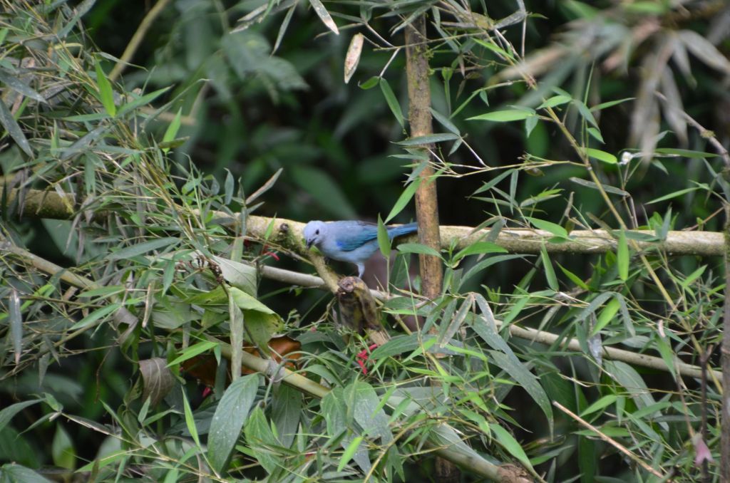 Doch man muss nicht einmal zwingend auf eine Birdwatching-Tour gehen. Schon von unserem Frühstückstisch aus schauen wir allmorgendlich ins Grüne. Und das Bananenbuffet ist auch schon bereitet. In der Tat stecken unsere Gastgeber regelmäßig ein paar Früchte in das Geäst. Eine von Vögeln gern genommene Spende. Teilweise entsteht ein regelrechter Wettstreit um den besten Platz an der Banane, bei dem die kleineren Vögel doch allzu oft das Nachsehen haben.