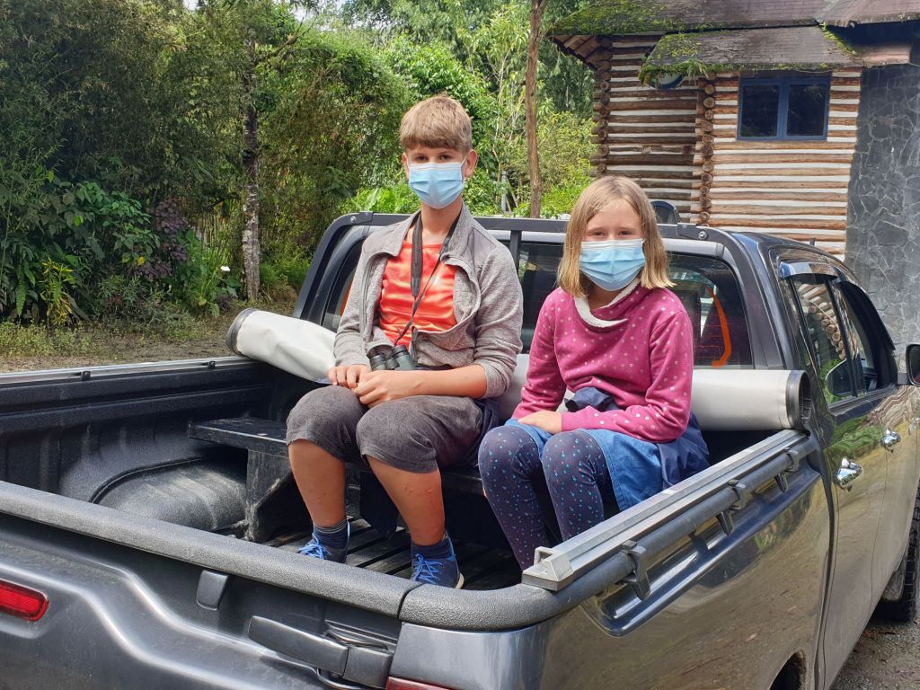 Wenig später, nach einem schönen Blick über das im Grün des Nebelwaldes fast schon versteckte Mindo erreichen wir nach ca. 6km den Fluss. Die letzten Meter bringt uns wieder der Wagen… und dieses Mal lassen sich die Kinder den Platz mit Ausblick nicht nehmen!