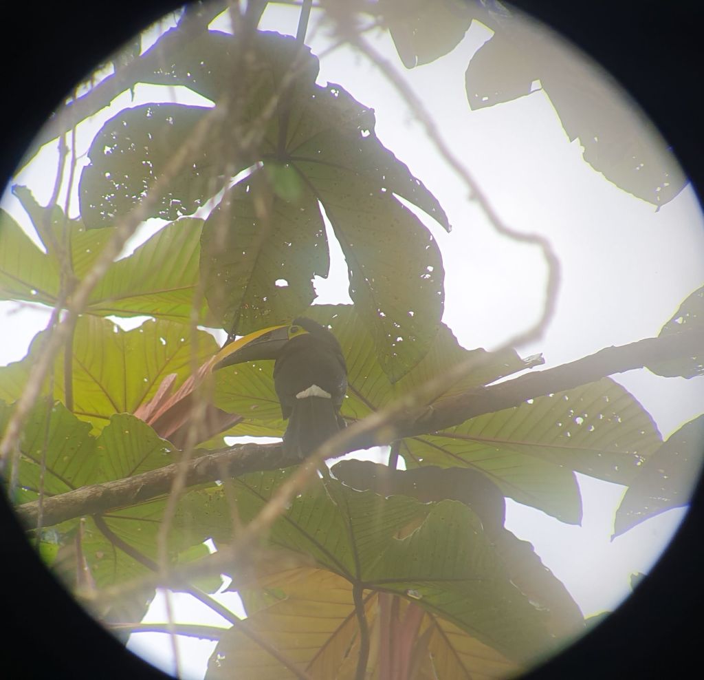 Julia ist super ausgestattet. Zwei gute Ferngläser sowie ein Beobachtungsfernrohr auf Stativ holen die munteren Vögel näher. Der Beginn ist aber noch recht zäh, Regen lockt nun mal keine Vögel hervor. Nur ein paar kleinere Freunde zeigen sich, unter anderem ein im Dachgebälk nistender Kolibri. Doch schon bald darauf macht Maila unsere erste richtig tolle Sichtung: ein Küstentukan!