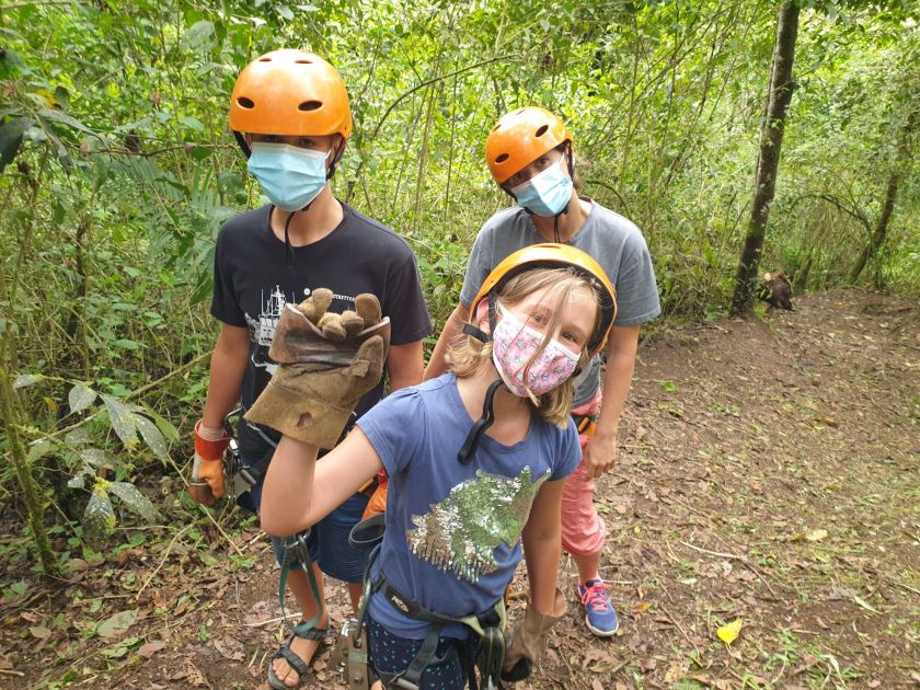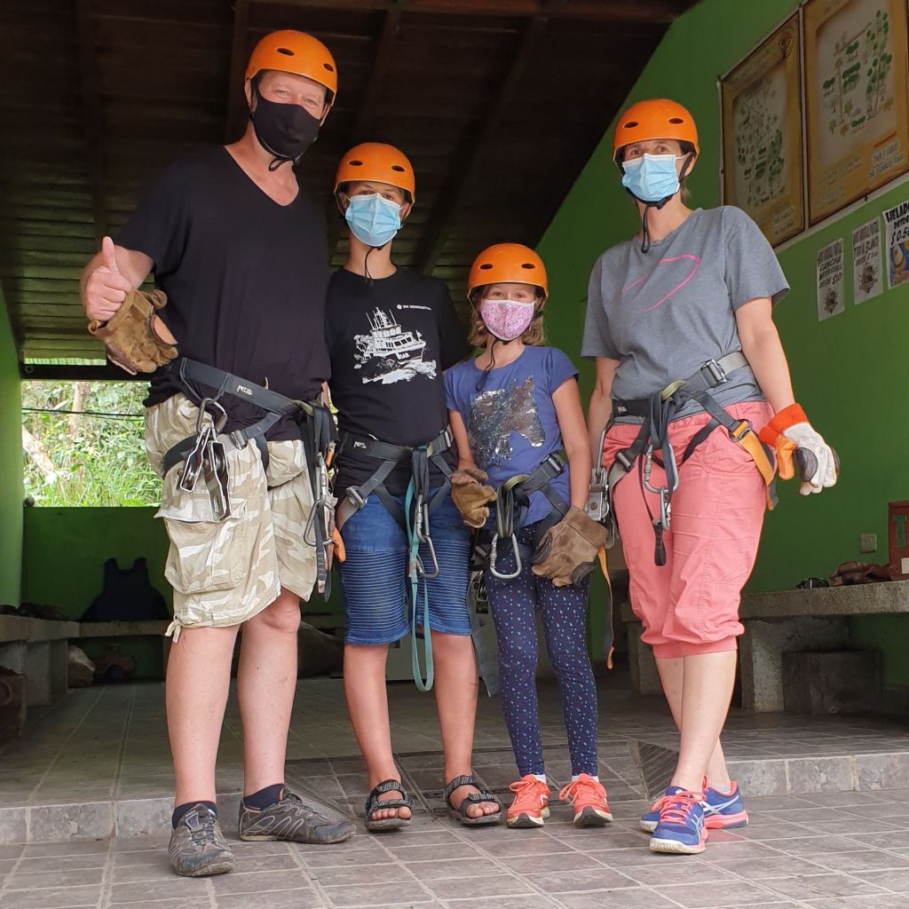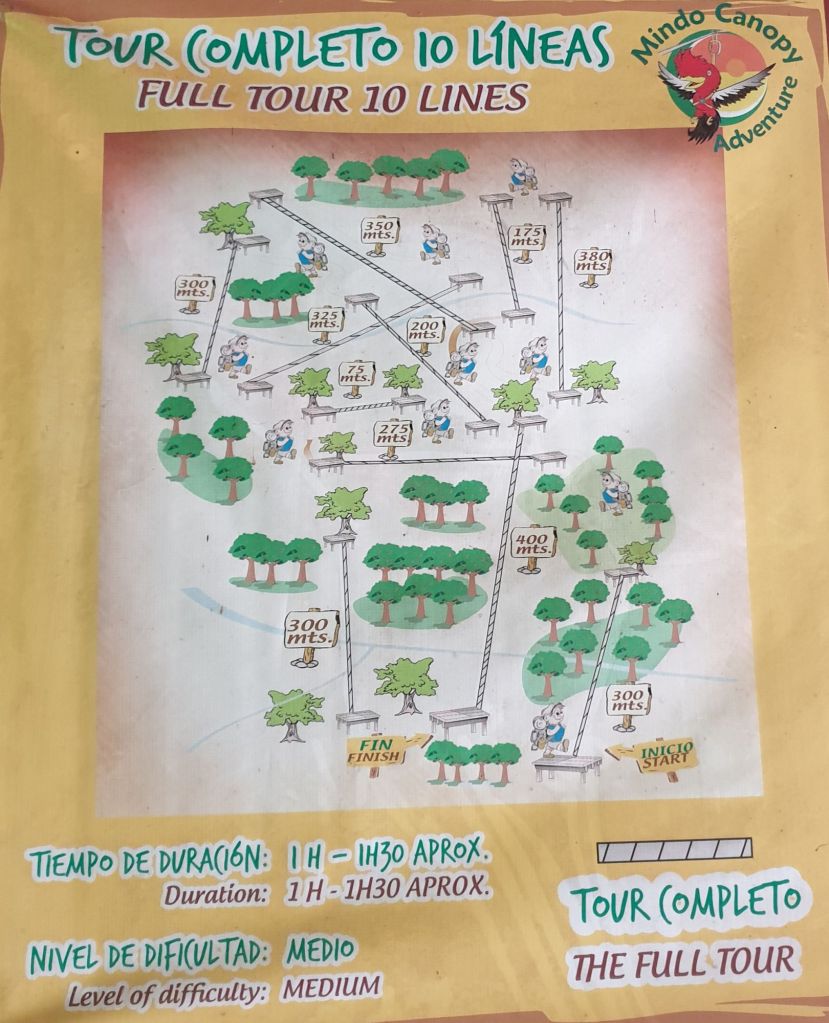 Von den zwei Anbietern ist aktuell nur einer geöffnet, doch immerhin ist es das uns ohnehin empfohlene „Mindo Canopy Adventure“. Der Name ist Programm. Wir wählen natürlich die ganze Tour. Die nächste Stunde werden wir also damit verbringen, uns 10x ans Seil zu hängen.