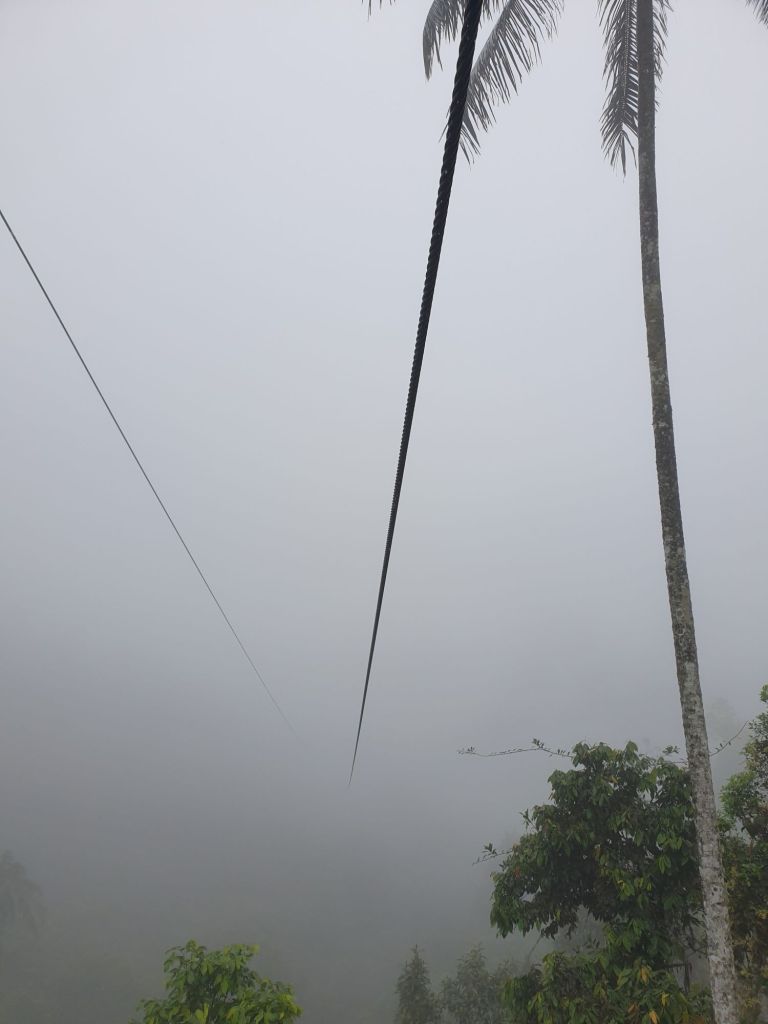 Die auf der Hinfahrt noch genossene Aussicht hat sich eingetrübt. Das Seil der Teleférico Montañero verschwindet in der Wolke, wir hinterher.