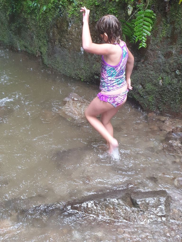 Auf dem Rückweg fassen ¾ der kleinen Expeditionsgruppe einen fast spontanen Entschluss. Am zweiten Wasserfall wird kurzerhand gebadet. Unsere Jüngste zieht ihr Badekleid an, die Jungs gehen schlicht im Schlüppi rein… geht ja nicht an, dass da noch ein letzte Kleidungsstück trocken bleibt.