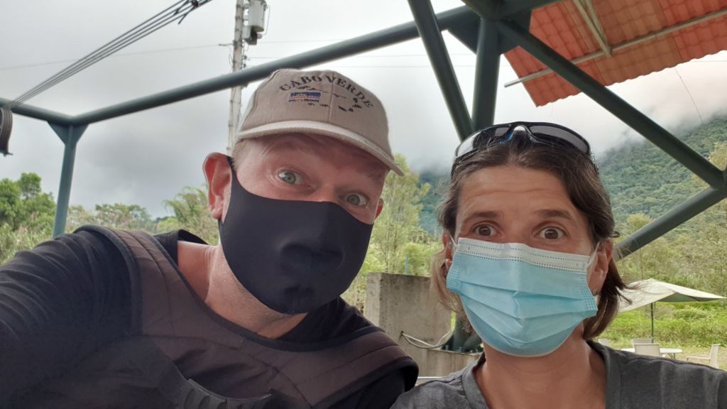 Irgendwann erreichen wir wieder die Tarabita. Selbstverständlich wird erneut gründlich desinfiziert. Im strömenden Regen. Das medizinisch vorgebildete Familienmitglied fragt sich still nach Sinn und Unsinn dieser Aktion, aber so ist das heutzutage nun einmal.
