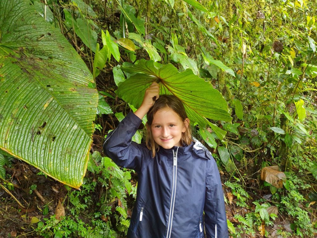 Es bleibt nass und wird nasser. Schon früh kommt Maila auf die Idee, ein großes Blatt als portablen Regenschutz zu verwenden. Samuel führt diese Kopfbedeckung noch lange weiter. Und selbst der Skipper greift nun zu einem Regencape, der Rucksack will geschützt werden. So wandern wir also hinab ins Tal zum Fluss der Wasserfälle. Die anfangs noch gegebene Illusion, zumindest das Schuhwerk halbwegs trocken halten zu können, zerplatzt mit den ersten den Weg kreuzenden und entlangfließenden Wasserläufen. Ja, der heutige Tag wird wohl insgesamt sehr nass werden.