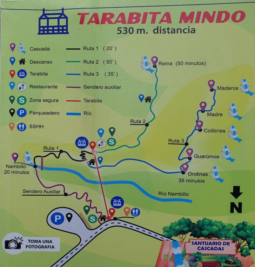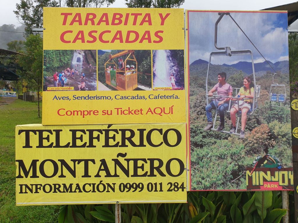 Einen kurzen Spaziergang später steigen wir um in die Tarabita. Ein gelber, natürlich frisch desinfizierter Korb bringt uns gut 500m über das Tal. Und da beginnt dann auch der Regen. Noch sind wir optimistisch. Bei der Sichtung unserer Wanderoptionen sind die Regensachen noch im Rucksack… nicht mehr lange. Wir entscheiden uns für Ruta 3… fünf Wasserfälle stehen auf dem Programm. Im Grunde nahe liegend… wenn schon nass, dann doch bitte gründlich. So machen wir uns auf den Weg…