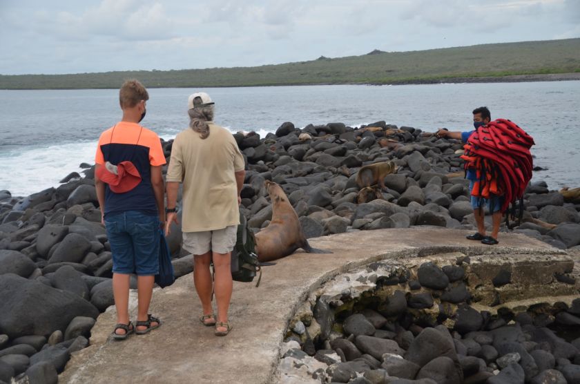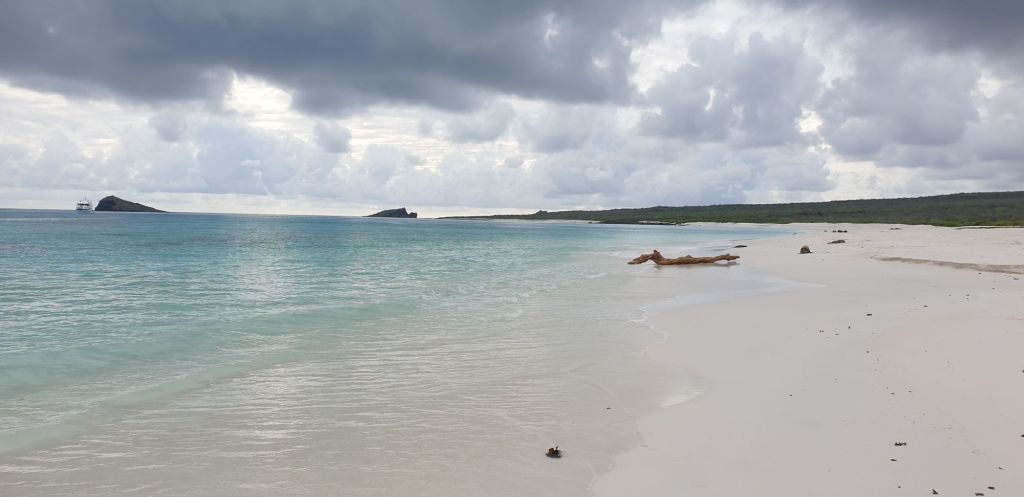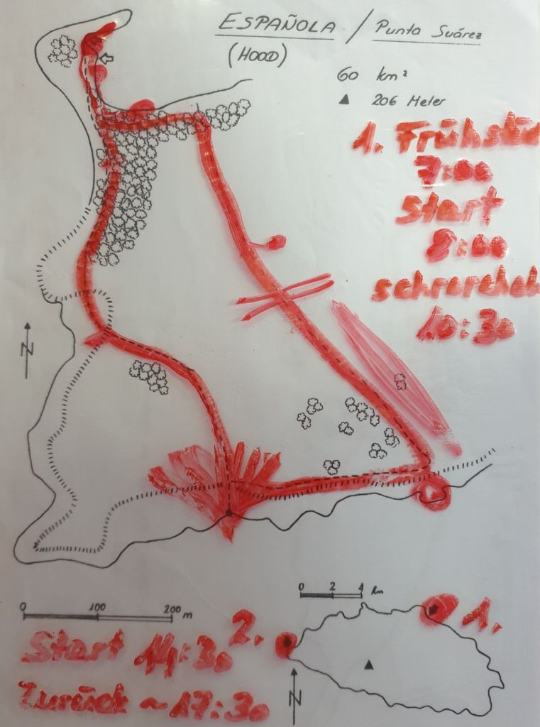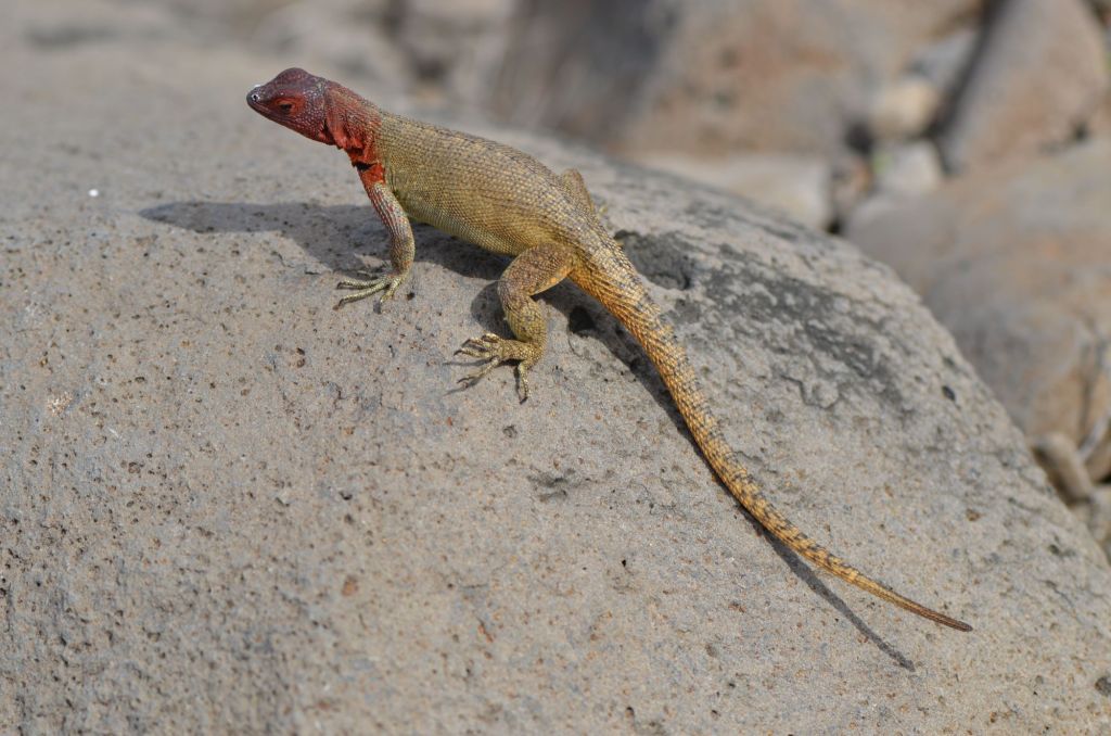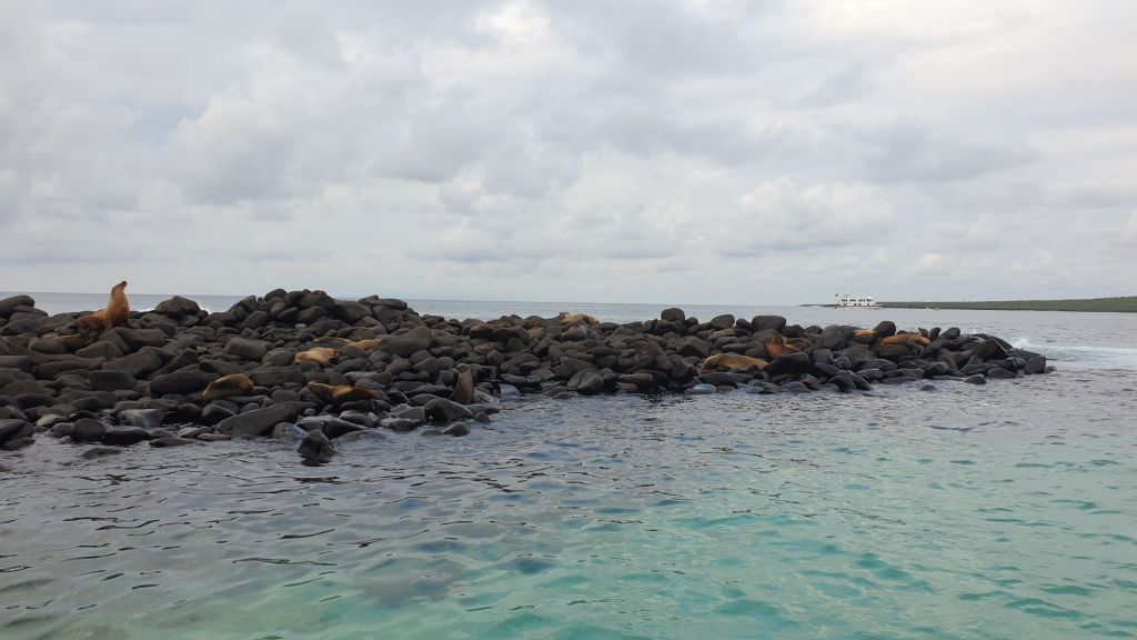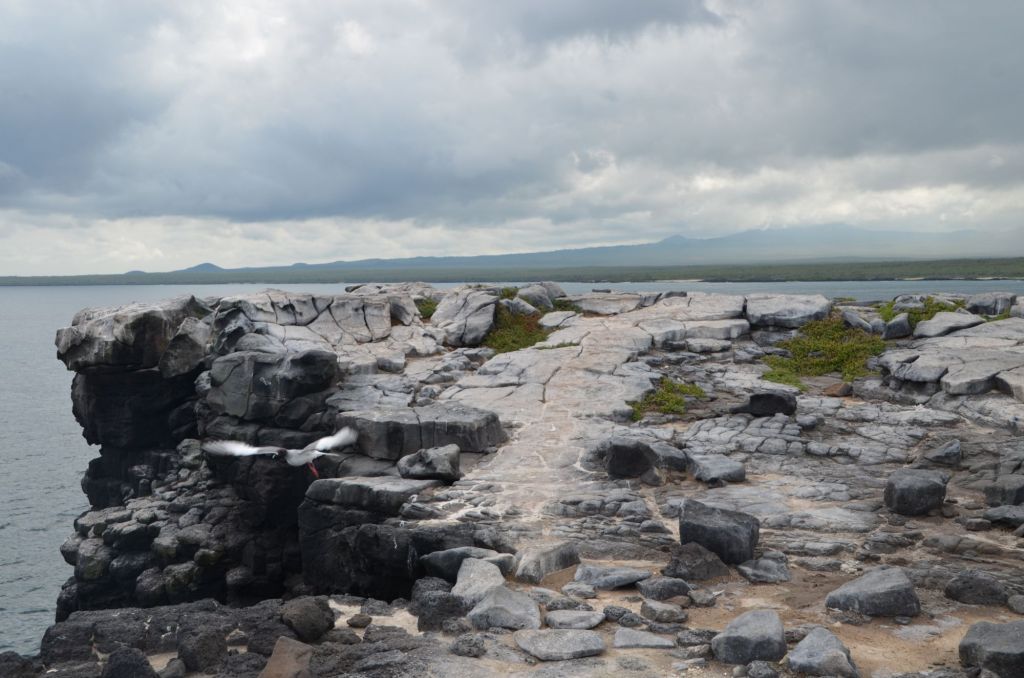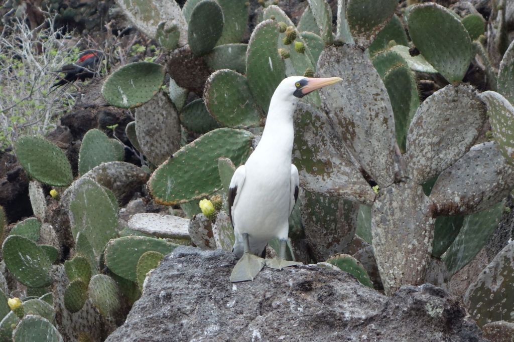 Wir betreten die erste Insel, wo wir mit der Angelito I hingefahren sind und werden sogleich von Vögeln begrüßt. Es sind die Vögel, die wir irgendwie auf so gut wie jeder Insel sehen. Ich spreche von den Fregattvögeln. Wir sind glücklicherweise genau in der Paarungszeit nach Galápagos gekommen. Also in der Zeit, in der die Fregattvogelmännchen Weibchen suchen. Dazu haben die Männchen ein rotes Säckchen, das vom Kinn bis zum Bauch geht. In der Paarungszeit bläht er sich auf, um den Weibchen zu imponieren. Die Weibchen sind übrigens gut zu erkennen, da sie ein weißes Federkleid an ihrem Hals haben. Leider sind die Fregattvögel auf andere Vögel angewiesen. Sie können nämlich nicht tief tauchen und ernähren sich von Fisch. Und den klauen sie von anderen. Darum geht es nun zu den bestohlenen Vögeln.