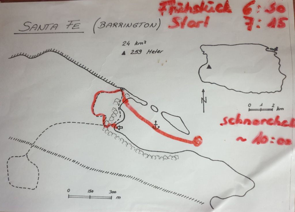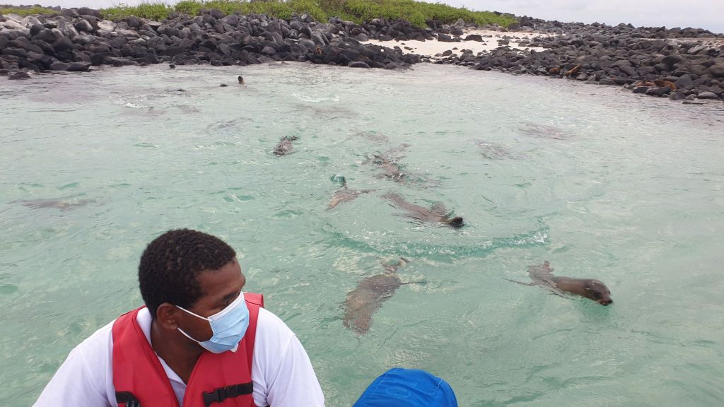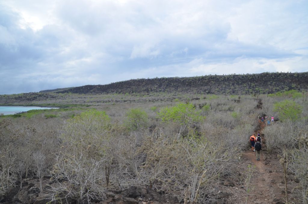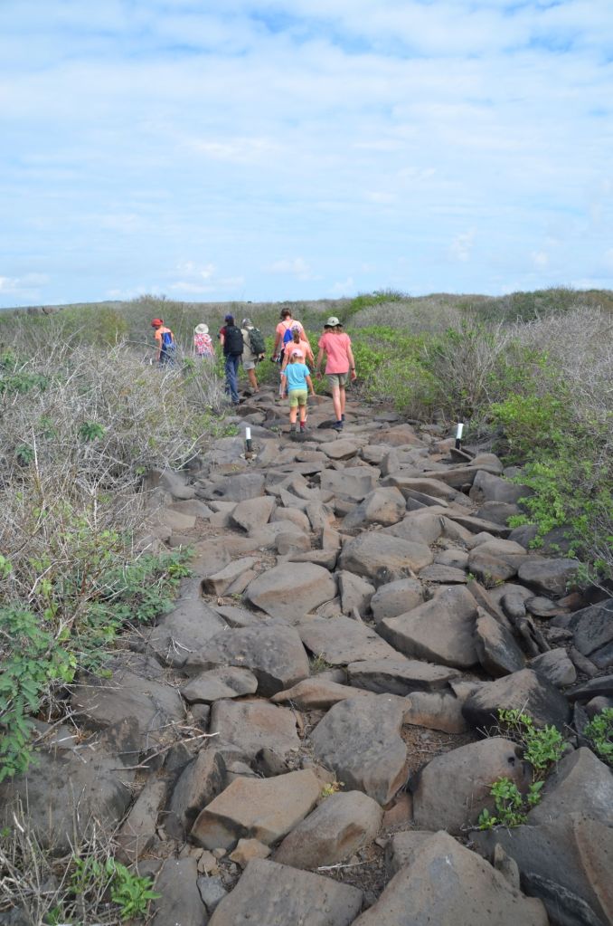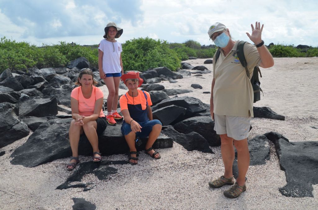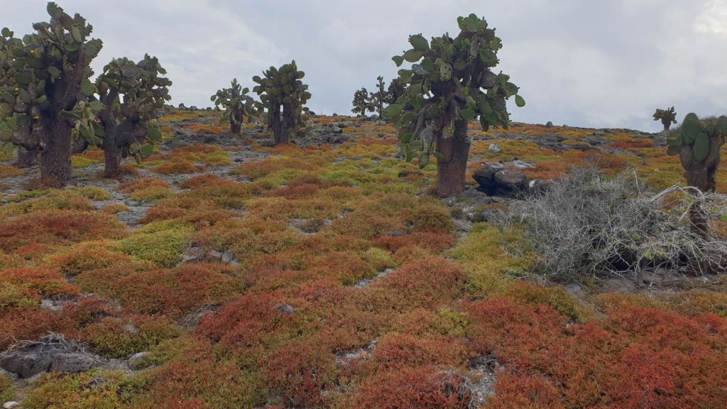 Wir betreten die erste Insel, wo wir mit der Angelito I hingefahren sind und werden sogleich von Vögeln begrüßt. Es sind die Vögel, die wir irgendwie auf so gut wie jeder Insel sehen. Ich spreche von den Fregattvögeln. Wir sind glücklicherweise genau in der Paarungszeit nach Galápagos gekommen. Also in der Zeit, in der die Fregattvogelmännchen Weibchen suchen. Dazu haben die Männchen ein rotes Säckchen, das vom Kinn bis zum Bauch geht. In der Paarungszeit bläht er sich auf, um den Weibchen zu imponieren. Die Weibchen sind übrigens gut zu erkennen, da sie ein weißes Federkleid an ihrem Hals haben. Leider sind die Fregattvögel auf andere Vögel angewiesen. Sie können nämlich nicht tief tauchen und ernähren sich von Fisch. Und den klauen sie von anderen. Darum geht es nun zu den bestohlenen Vögeln.