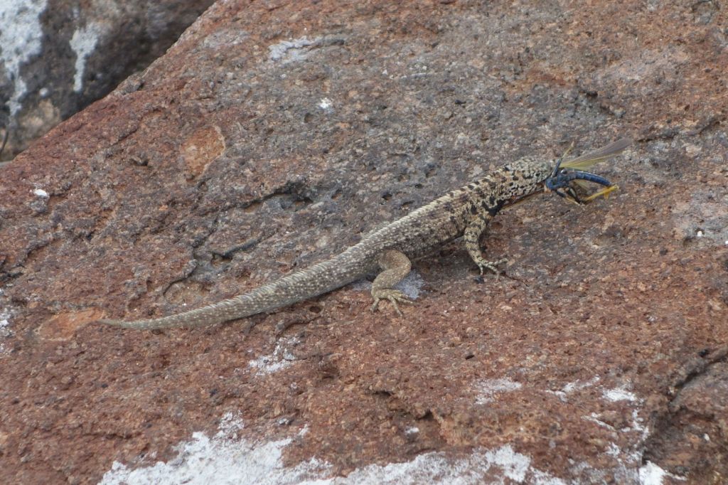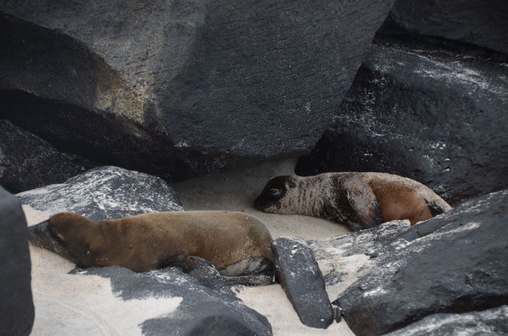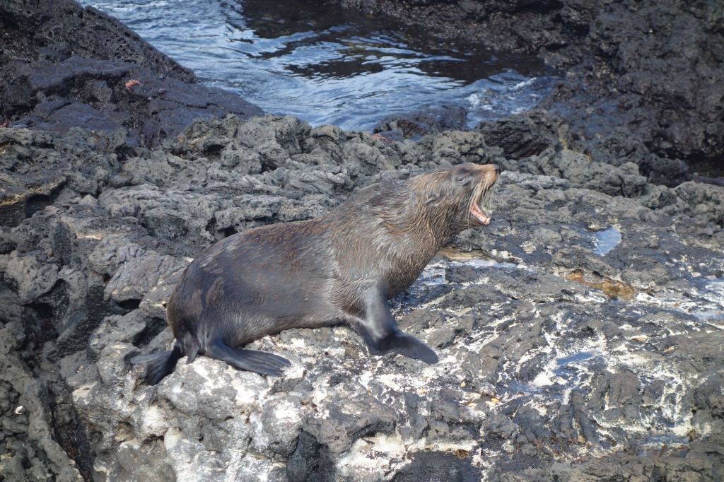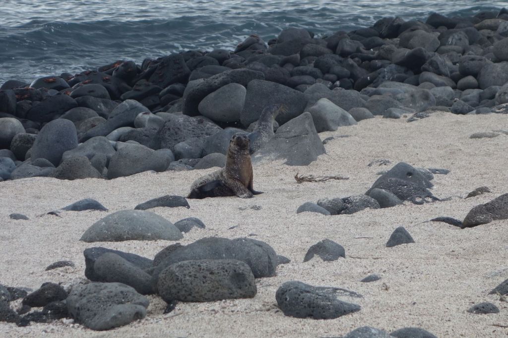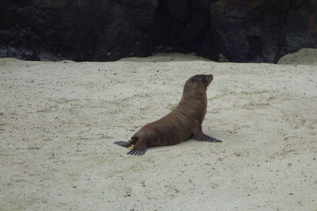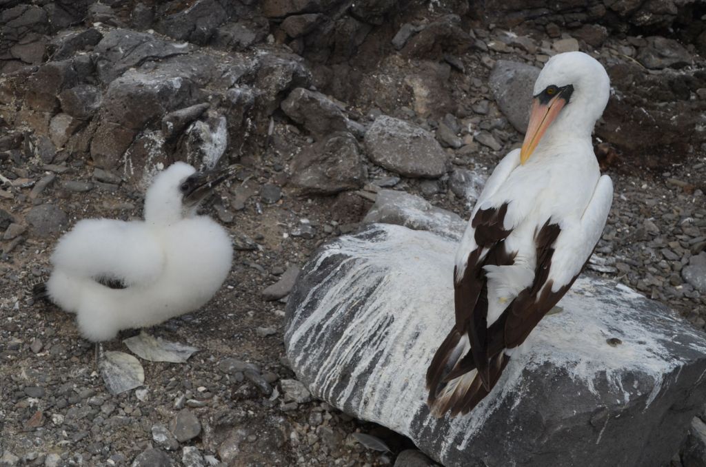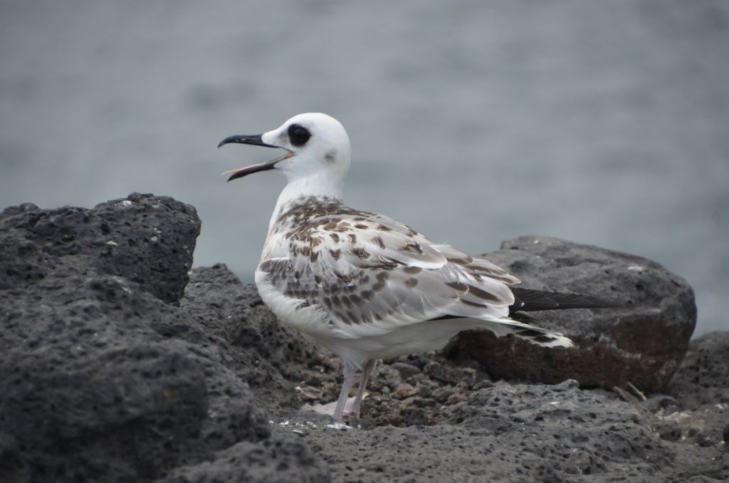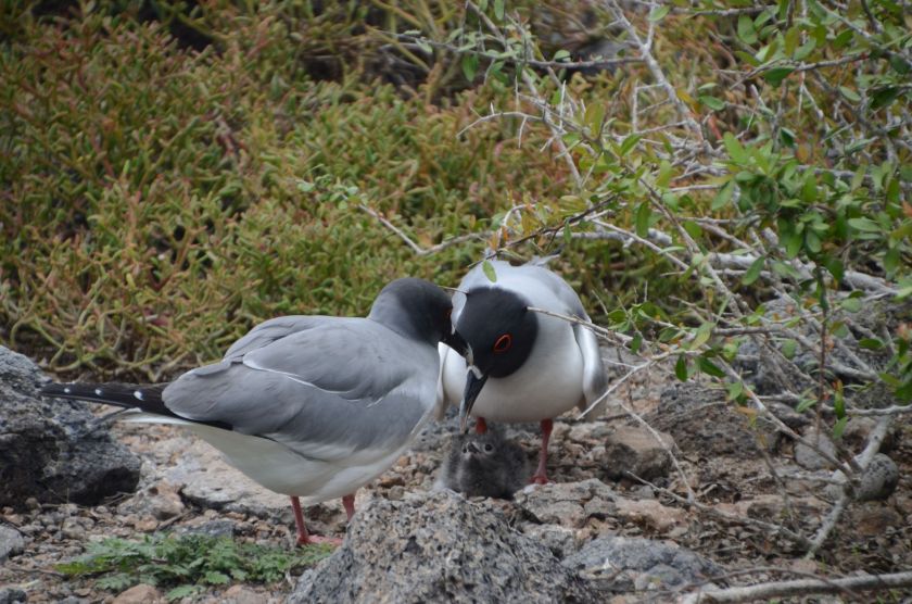 Wir haben ein Paar Gabelschwanzmöwen mit einem Baby gesehen. Leider ist das Stück Kalmar, das ein Elternteil gefangen hat, zu groß für den Kleinen und der Partner erhält ihn um ihn zu zerkleinern. Und dann bekommt auch die Babymöwe etwas ab. Die Möwe hat rote Augenlider. Wozu genau die gut sind, weiß ich nicht, aber ich weiß, dass sie richtig cool aussehen. Es ist Mailas Lieblingsmöwe.
