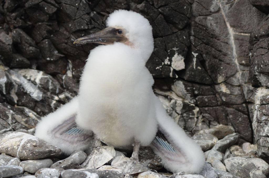 Das waren viele Tölpel ja, aber es gibt noch einen. Den Galápagos-Maskentölpel oder den Nascartölpel. Es ist ein und dieselbe Art, wurde aber umbenannt. Er hat ein seltsames Gesicht, das wie eine Maske aussieht. Daher der Name. Er ist ähnlich wie die anderen Tölpel, hat aber keine farbigen Füße und keinen blauen Schnabel.