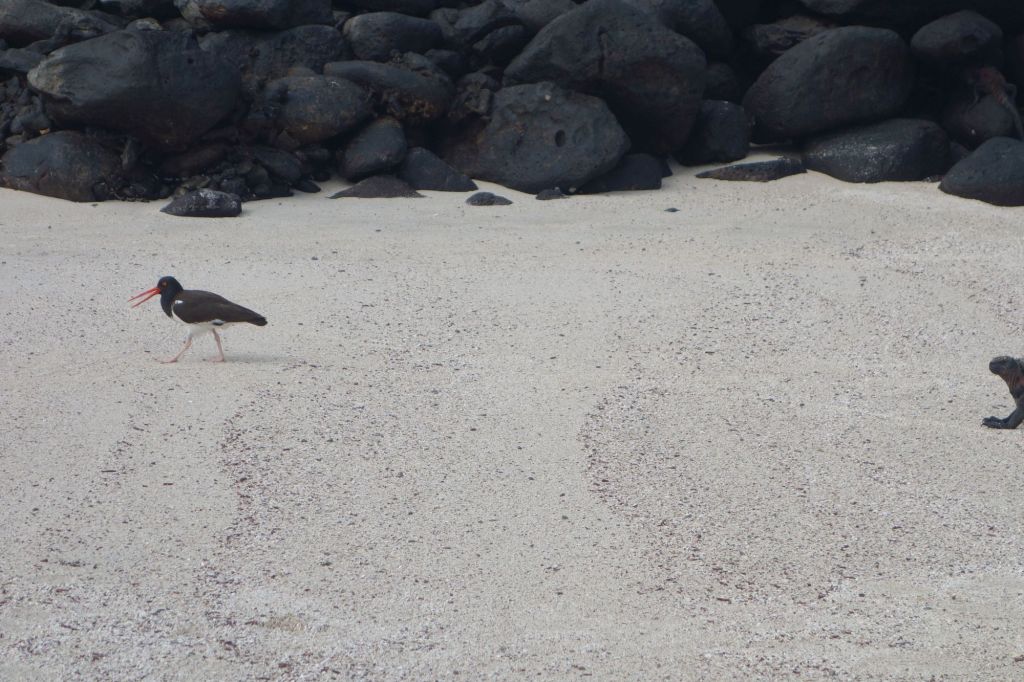Zu meiner Überraschung haben wir auf Galápagos auch Austernfischer gesehen, die ich dort nicht vermutet hätte. Sie haben lange Beine und einen langen roten Schnabel. Ihr Gefieder ist pechschwarz.