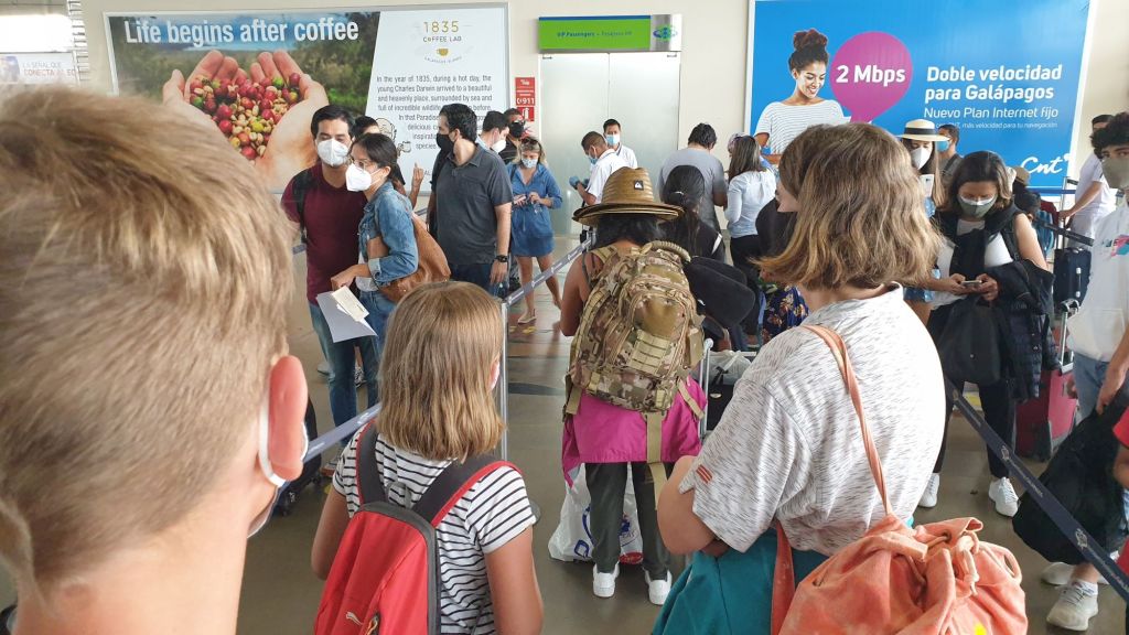 Nach der Landung stehen wir dann doch noch in der Schlange. Das mit dem Sicherheitsabstand wird mal mehr und mal weniger genau genommen, aber im Grund müssen ja alle Passagiere in letzter Zeit getestet worden sein. Diese Tests sind vorzuzeigen, danach die pro Person 100$ Eintritt für den Nationalpark zu zahlen (nur Bares ist Wahres!), Handgepäck nochmal durchleuchtet und endlich sind wir offiziell angekommen.