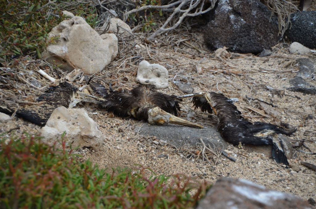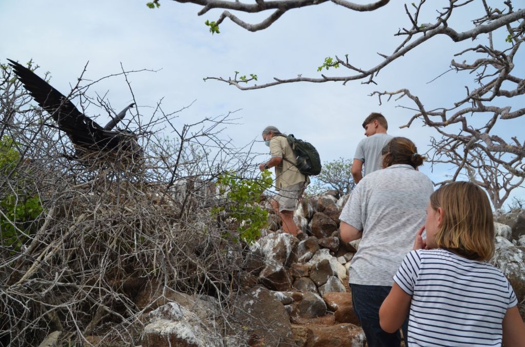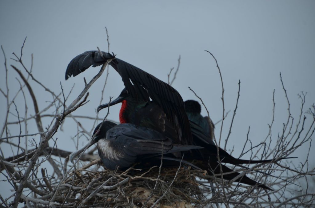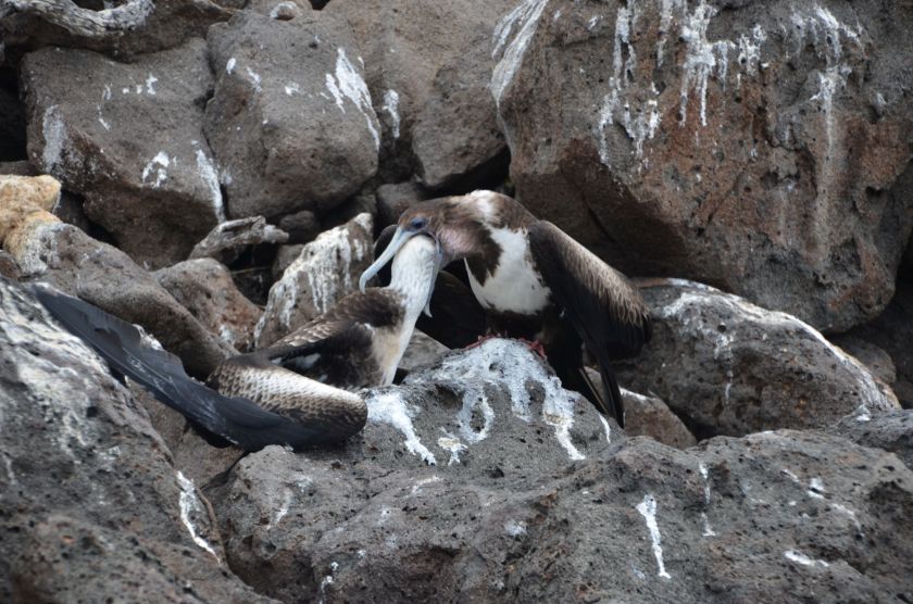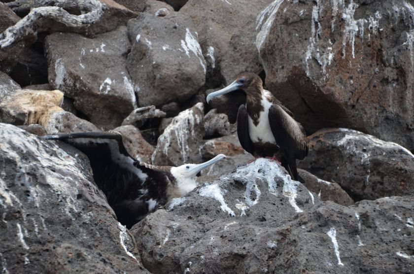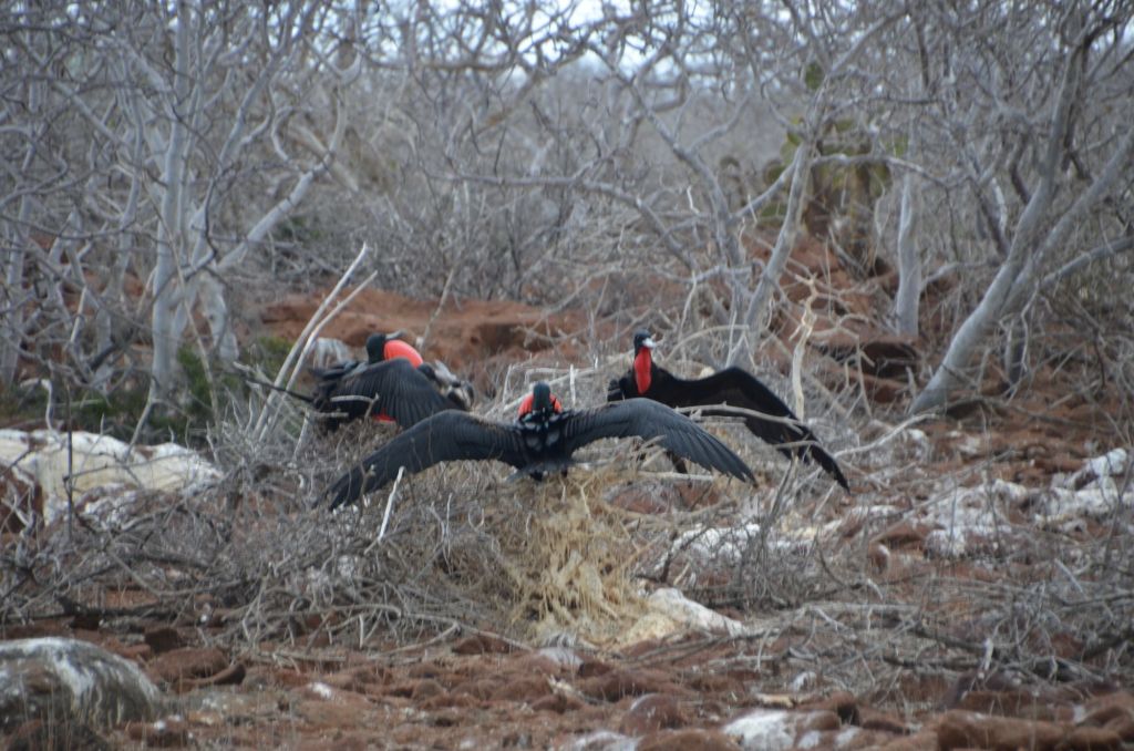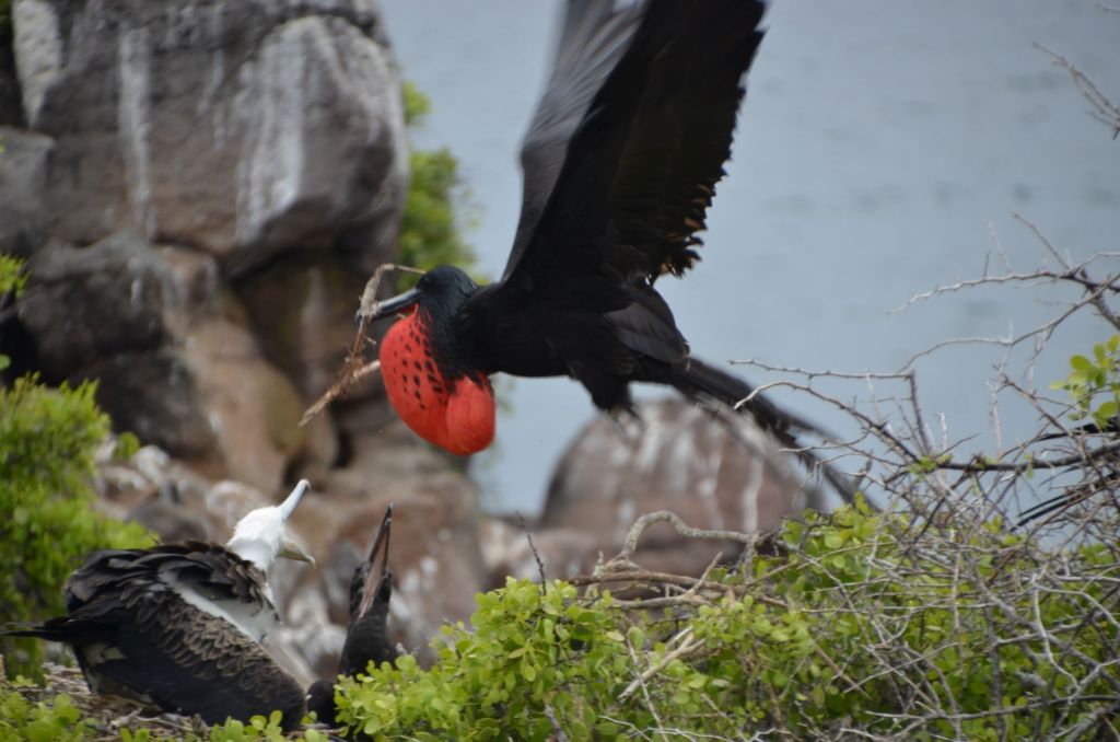 Die See ist recht ruhig, so können wir mit den Zodiacs an der spannenderen Stelle anlanden… mitten in eine kleine Kolonie von Fregattvögeln. Überall fliegen die großen Tiere in der Luft, bei paarungswilligen Männchen hängt der große rote Kehlsack herunter. Zwischen den Ästen und Steinen finden sich immer wieder Nester mit Jungtieren, die am Himmel ihre Fütterer suchen und bei Sichtung Laut geben.