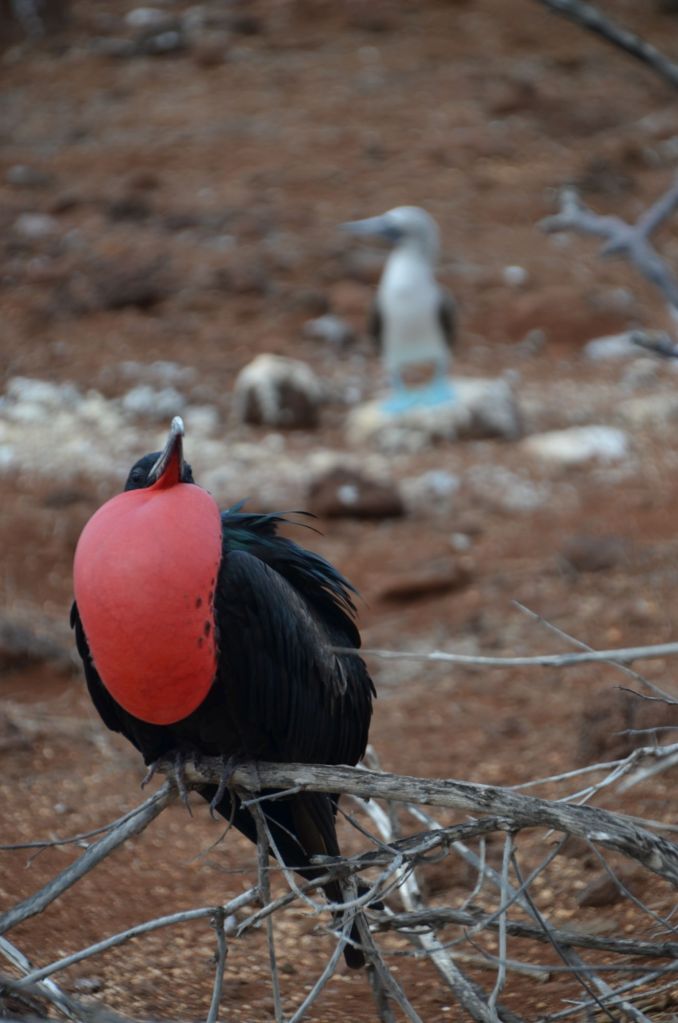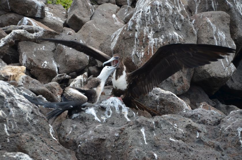 Fregattvögel sind zwar schön, gerade die Männchen mit ihrem roten Kehlsack sogar imposant anzuschauen, im Grunde aber ganz schon fiese Vögel. Sie selbst haben Probleme damit, im Meer auf Fischfang zu gehen. Nicht nur sind die Beine zu kurz zum Schwimmen, ja selbst das Gehen klappt ja schon kaum. Dazu wird nicht ausreichend Sekret zum wasserdichten Einölen des Gefieders produziert. Was sie dagegen richtig gut können ist fliegen… und klauen! Es handelt sich um einen sogenannten Kleptoparasiten, der seine Nahrung hauptsächlich von anderen Vögeln stiehlt. Dabei schreckt er auch nicht davor zurück, mitten in eine Fütterung zu platzen. Mehr als einmal beobachten wir im Luftraum der Galápagos-Inseln wahre Jagdszenen zwischen hungrigen Fregattvögeln und anderen Seevögeln, die ihren erfolgreichen Fang verteidigen.
