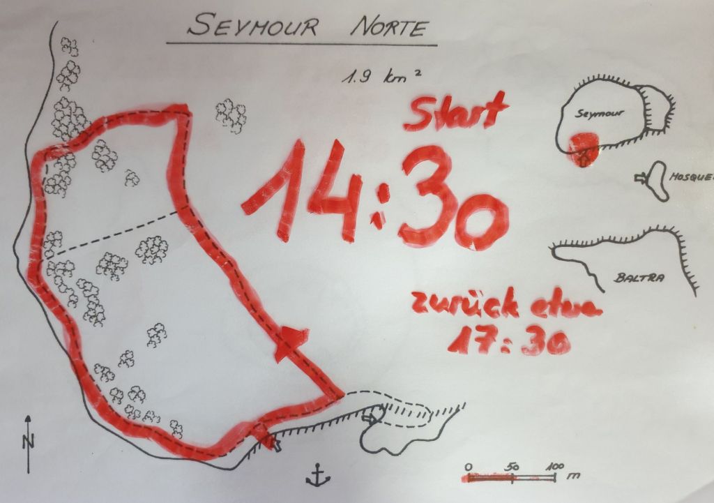 Nach einer kurzen Fahrt, leckerem Mittagessen und der schon angesprochenen Einführung in die Verhaltensregeln des Nationalparks machen wir uns gleich am Tag unserer Ankunft auf den ersten Landausflug. Auf dem Programm steht eine gut 3-stündige Wanderung auf Isla Seymour Norte.