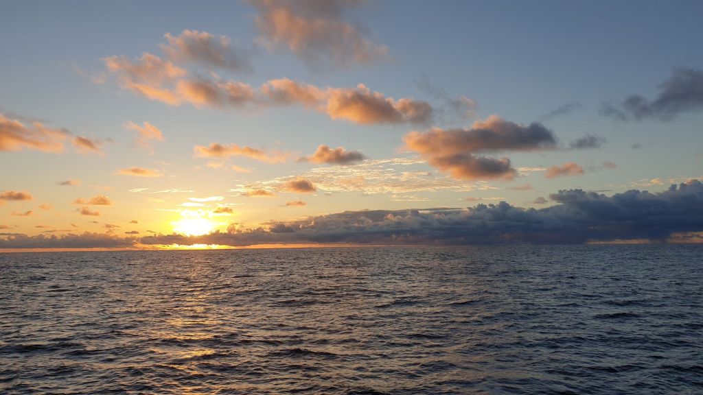 Der Tag selbst verlief ebenso entspannt. Vormittags zieht sich voraus mal ein Wolkenband quer über den Ozean. Mit kurzem Regenschauer sind wir durch und genießen den Rest der Fahrt bei Sonnenschein. Eine kleine Schwalbe stattet uns einen Besuch ab. Erst an Deck, schaut sie sich dann unser Bad und in einem weiteren Anlauf Pantry, Salon und Vorschiffskabine näher an. Um ihr kleines Angstgeschäft kümmert sich dankenswerter Weise unser großer Tierfreund Samuel.