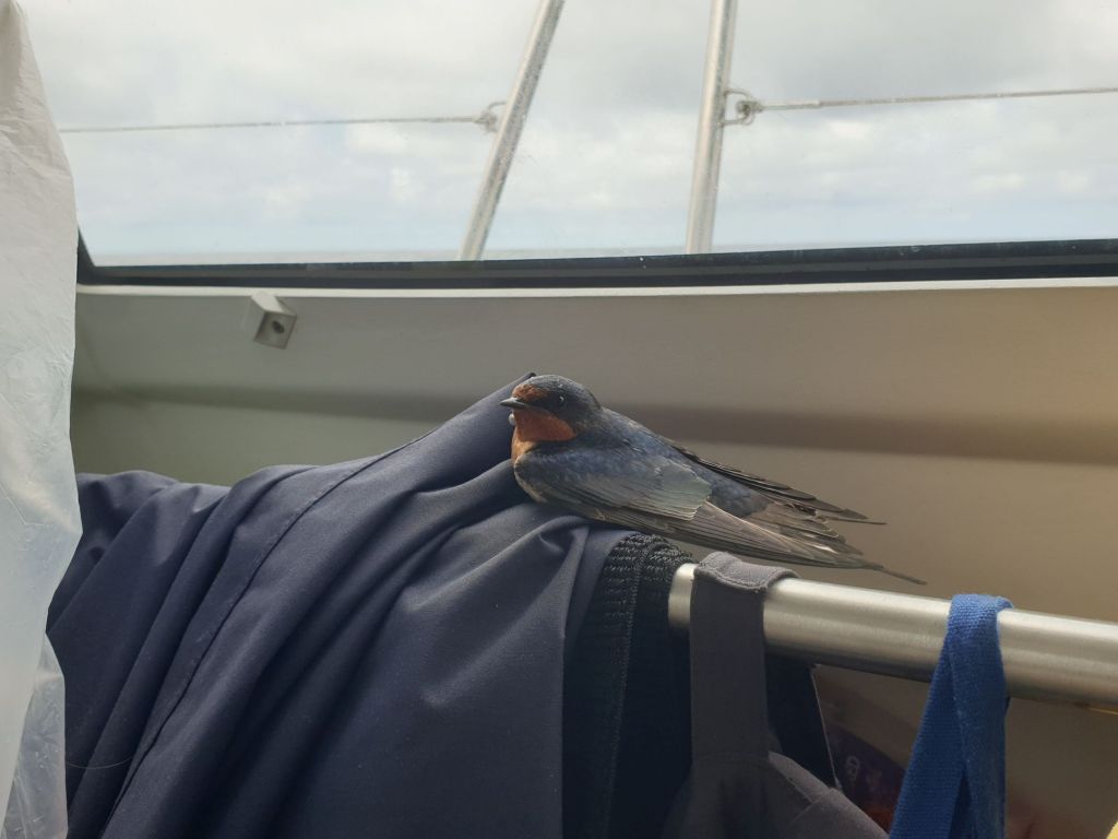 Einige Tage zuvor gab es auch noch einen solchen Besuch. Er war ganz anders! Der Vogel ist deutlich größer und sieht so aus, wie eine Schwalbe mit einem roten Kelchen. Und er ist deutlich frecher. Diese kleine Schwalbe hat sich nämlich einfach durch das offene Klofenster in unsere Toilettenräume begeben und selber nicht den Weg wieder herausgefunden. Papa musste ihn mit der Hand einfangen und draußen wieder freilassen. Das zweite Mal ist er einfach durch die offene Tür der Toilette wieder nach draußen geflogen.