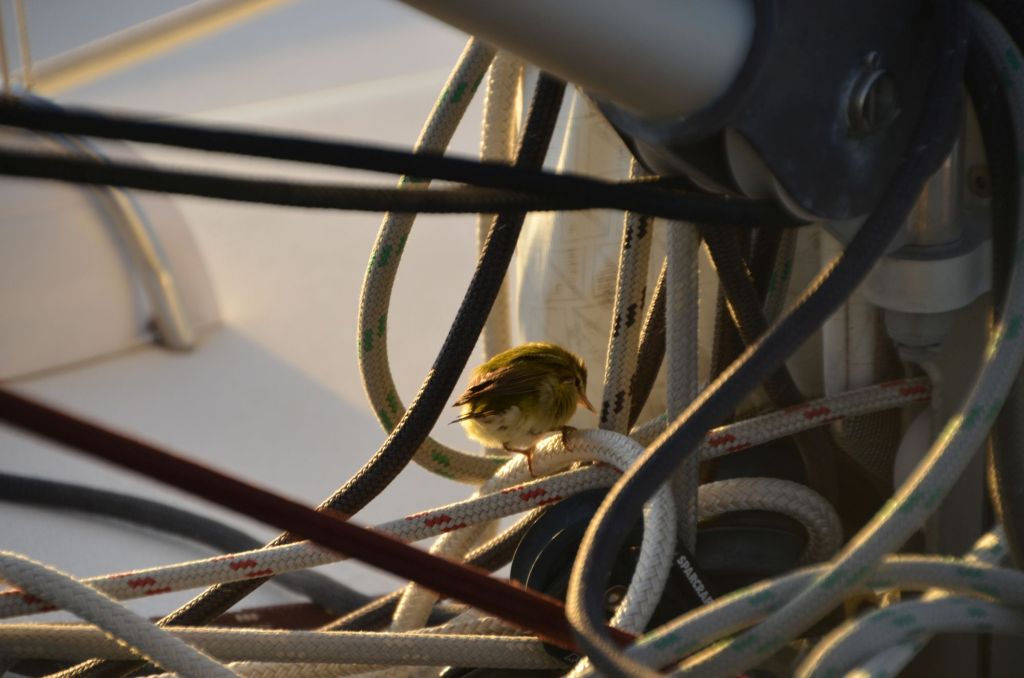 Schließlich macht er eine längere Pause auf der perfekten Vogelschaukel unter dem Radar. Das Radar über ihm schwingt hin und her, genau wie das Kabel darunter. Dort sitzt der Vogel, genießt die Aussicht und lässt sich den Wind um die Nase… ähm ich meine natürlich um den Schnabel wehen.