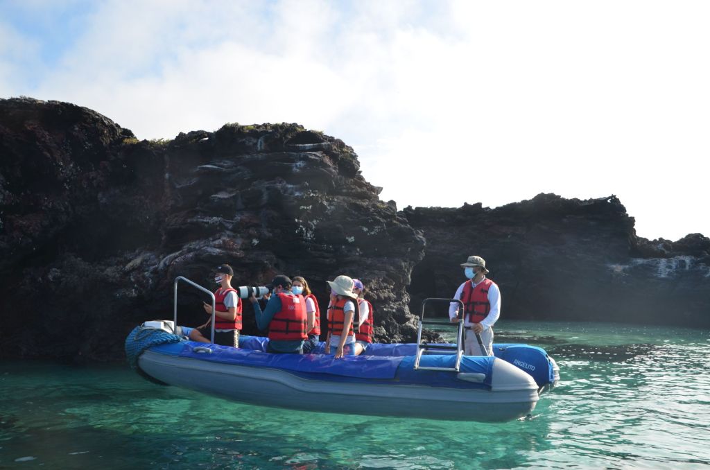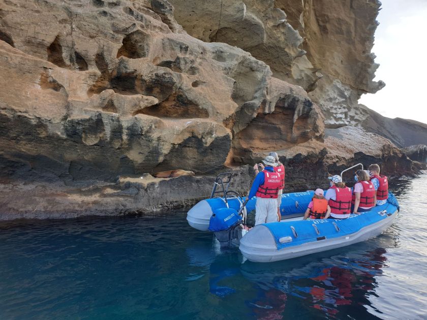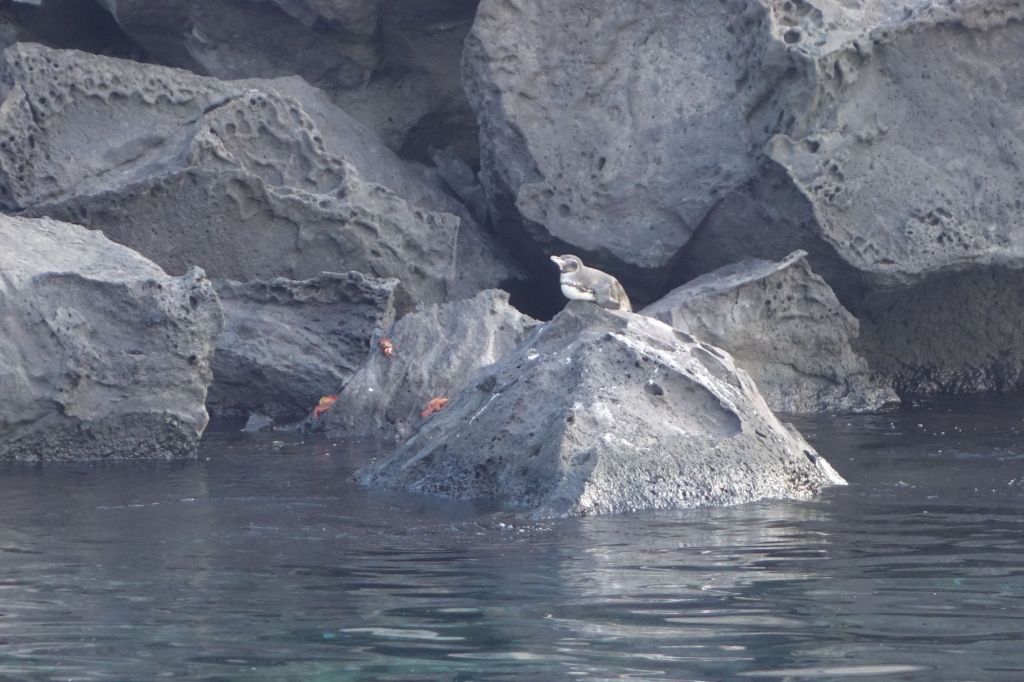 Zurück im Zodiac machen wir dann noch eine kleine Rundfahrt und werden mit Galápagos-Pinguinen und in den Felsen liegenden Seelöwen belohnt.