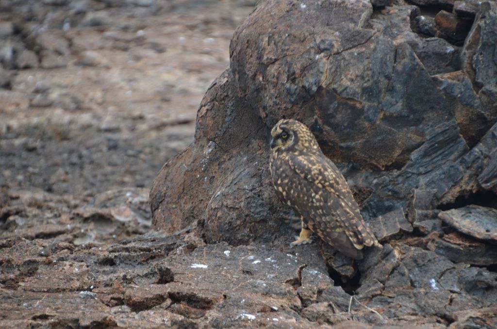 Dann beginnt die große Suche. Wo ist die Sumpfohreule? Recht klein und perfekt getarnt hält sie sich zur Jagd vor allem am Boden auf. Zuerst finden wir Gewölle mit Kopf und Schnabel. Die Sumpfohreule frisst bevorzugt ganze Tiere. Schließlich entdeckt La Skipper das erste Exemplar regungslos neben einem Stein stehend. Die zweite Sichtung geht auf eines der Schweizer Kinder.