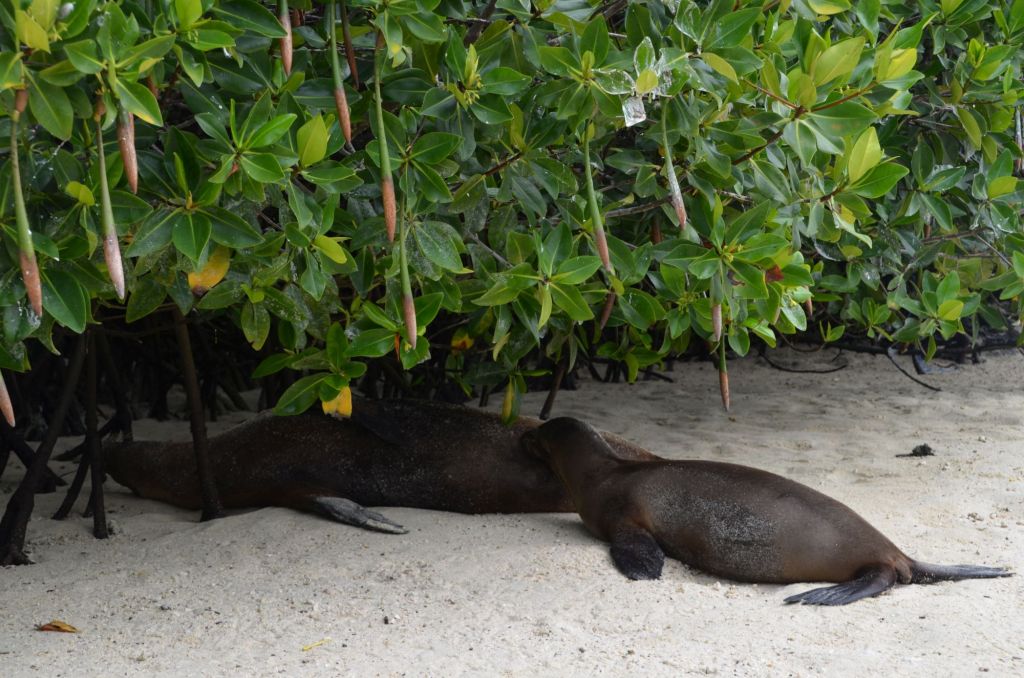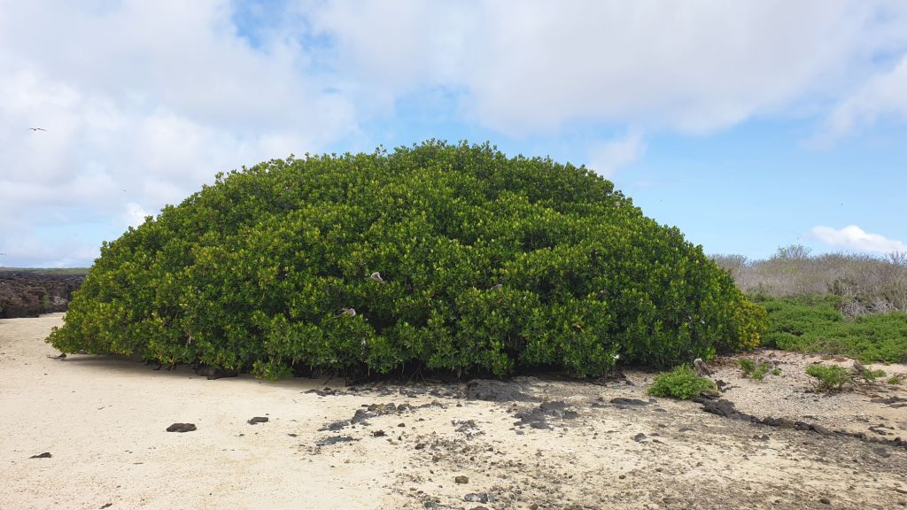 Bei diesem Spaziergang erzählt uns Maja auch die Geschichte der Wollsackschildlaus. Sie wurde eingeschleppt und hat sich ohne natürliche Feinde sogleich daran gemacht, ganze Abschnitte von Mangroven und anderen Pflanzen zu vernichten. Es wurde einiges versucht, um die Plage in den Griff zu bekommen, doch Abhilfe schaffte erst die „kalifornische Lösung“. Dort hatte man das gleiche Problem mit Hilfe von australischen Marienkäfern gelöst. Diese fressen die Wollsackschildlaus und sterben selbst, wenn letztere nicht mehr da ist. Nach jahrelangen Studien gab es für dieses auf Galápagos eigentlich undenkbare Vorgehen grünes Licht und es hat funktioniert. Werden heute irgendwo von einem der aufmerksamen Guides Wollsackschildläuse gemeldet, müssen nur ca. 40 dieser Marienkäfer ausgesetzt werden und das Problem hat sich in 2-3 Wochen erledigt.