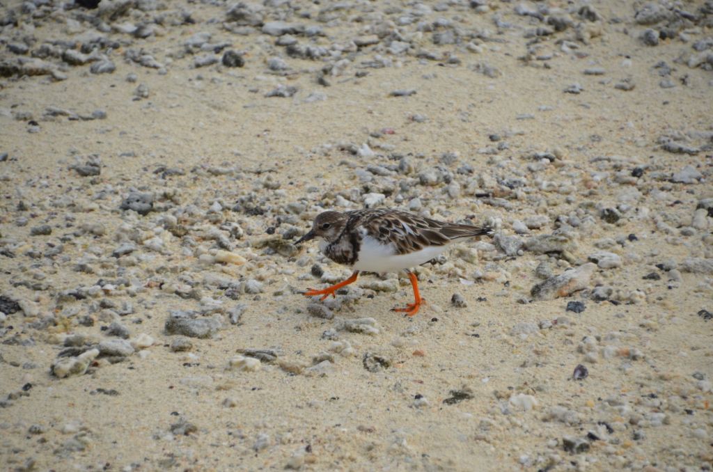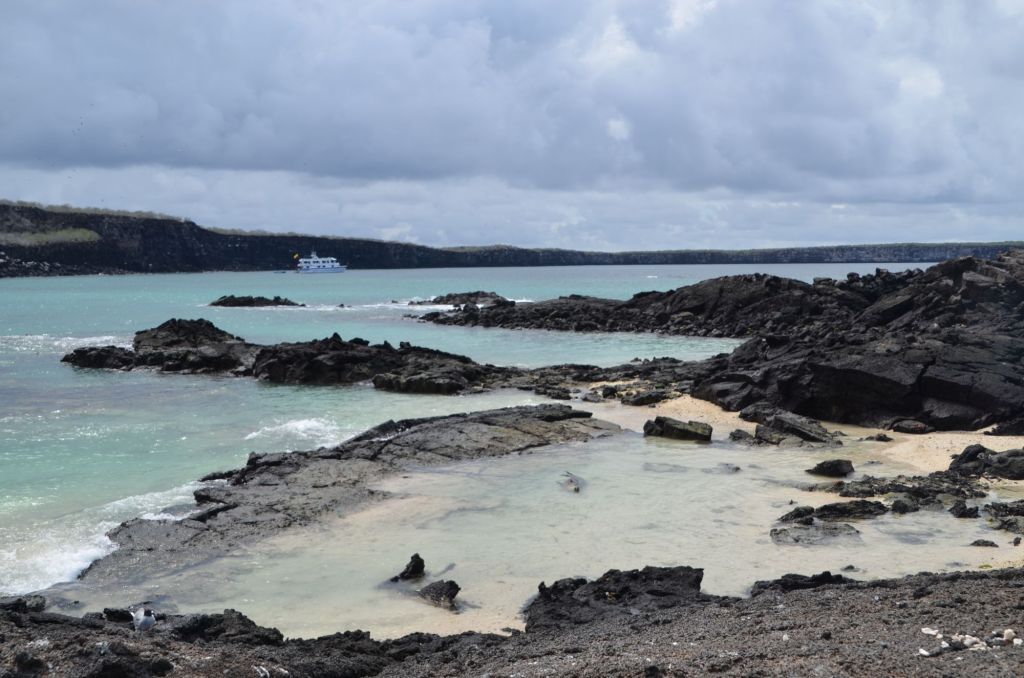 Am Wendepunkt unseres kleinen Spazierganges gehen wir auf Meeresgrund. Zumindest bei Hochwasser ist hier alles überflutet. An den Steinen kleben Austern und Muscheln. Die lila gefärbten sind besonders alt, kleine Galápagos-Winkerkrabben machen auf sich aufmerksam, ein paar hier besonders kleine Meeresleguane laufen durch die Steine und natürlich liegen auch Seelöwen herum. Wie immer alles sehr entspannt und wenig scheu. Eine Ausnahme bildet lediglich der Steinwälzer. Der überwintert in Kanada und lernt dort, dass ein wenig Vorsicht nicht schaden kann.