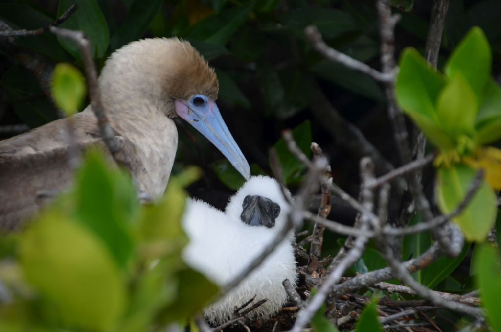 Der Nistplatz in den Mangroven ist gut gewählt, bietet er doch Schutz vor den größeren Fregattvögeln. Die kommen hier nicht rein und können demnach auch nicht beim Füttern stören. Natürlich verhindert das nicht, dass sie die Tölpel ersatzweise in der Luft angehen. Wir kommen zur richtigen Zeit. Viele kleine Tölpel-Plüschbälle schauen uns neugierig aus ihren schwarzen Knopfaugen an.