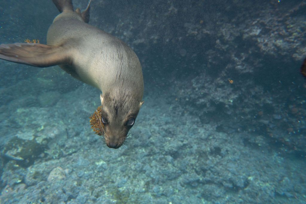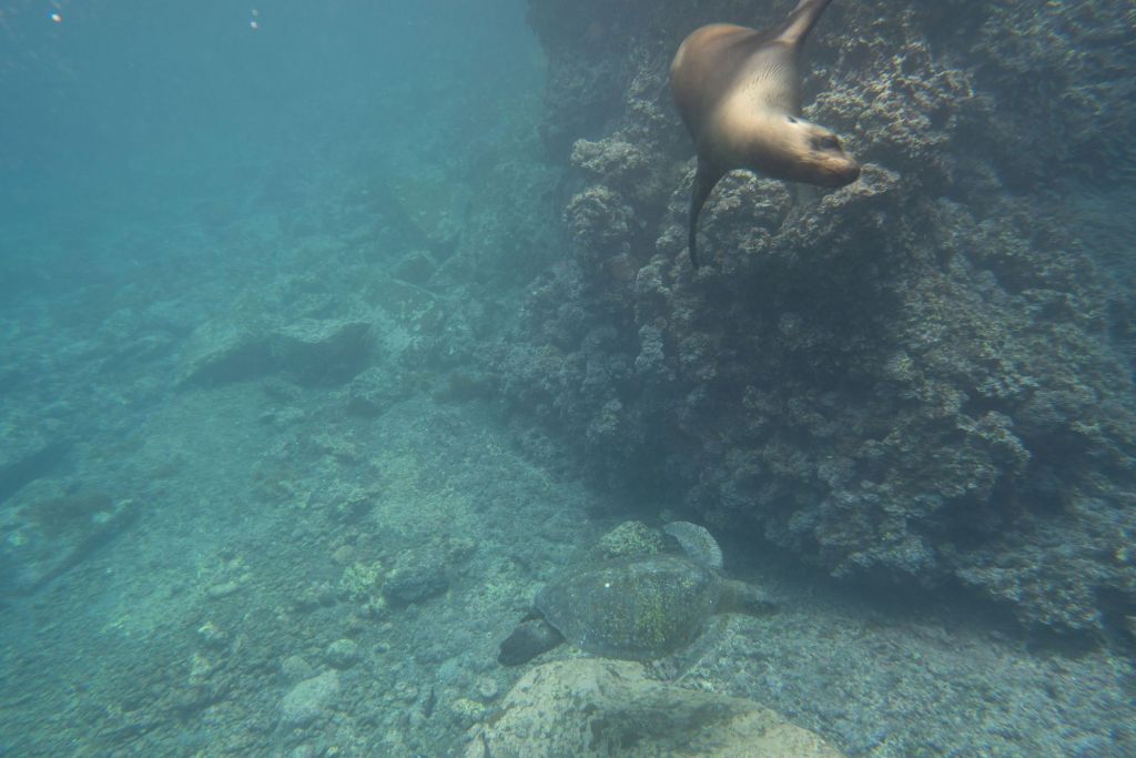 In der selben Bucht spielen etwa zehn Galápagos-Seelöwen. Papa ist genau dort hinein geschwommen. Ich habe es aber verpasst das zu fotografieren. Auf dem Spielplatz für die Seelöwen habe ich trotzdem super süße Bilder gemacht. Eines davon ist eine Robbe mit einem Stück Alge im Mund. Einige der Seelöwen sind außerdem so dicht an mir vorbei geschwommen, dass mich ihre Tasthaaren – oder wie man die bei Seelöwen nennt – berührt haben.