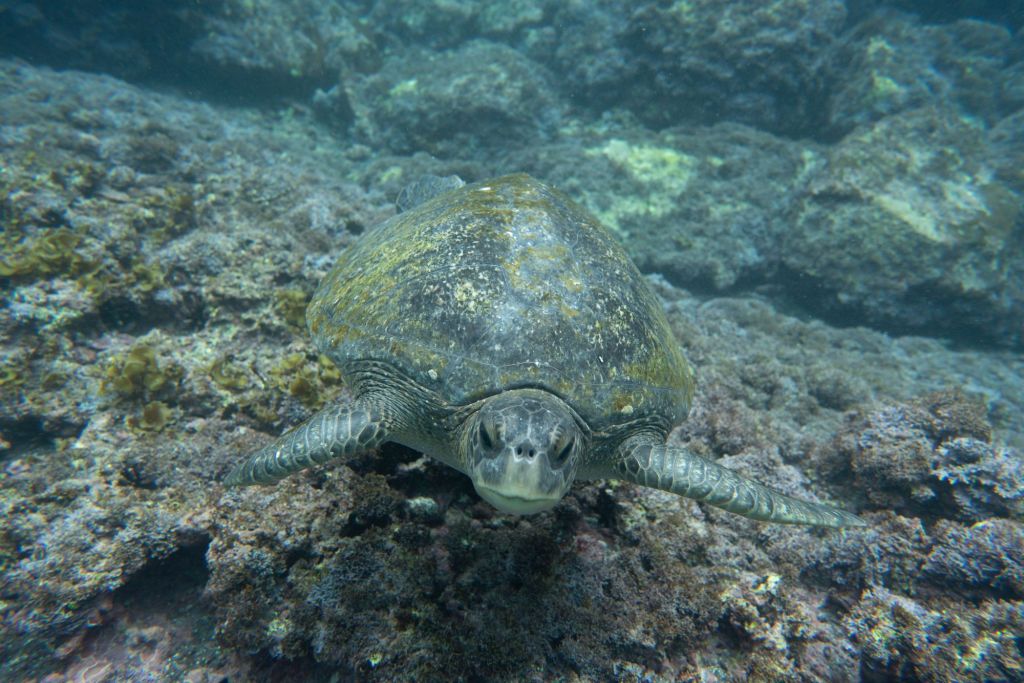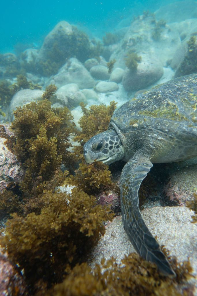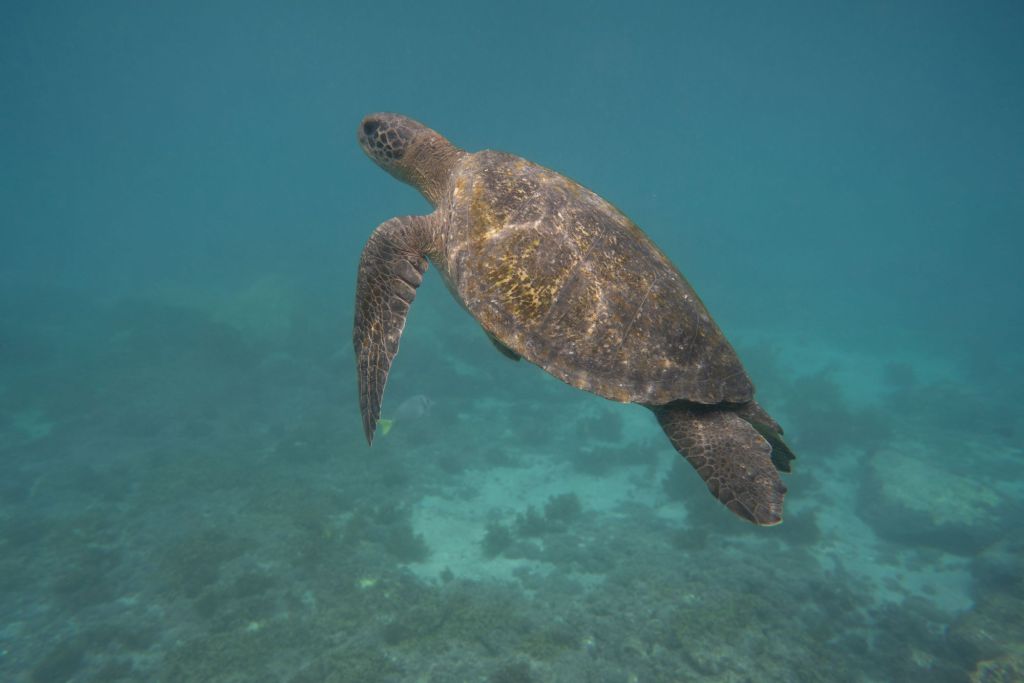 Etwas Gefährliches, zumindest denken das viele, ist das Schnorcheln mit Haien! Ja, ich meine Haie! Überall außer auf Galapagos ist es auch nicht ungefährlich! Wir schnorcheln mit erwachsenen Weißspitzenriffhaien sowie mit kleinen Babyhaien. Mit den kleinen Babyhaien sind auch einige Schildkröten im Wasser gewesen, an die ich fast einen halben Meter heran schwimmen kann. Eine der Schildkröten hat wohl Hunger, weshalb sie Algen vom Stein abfrisst.