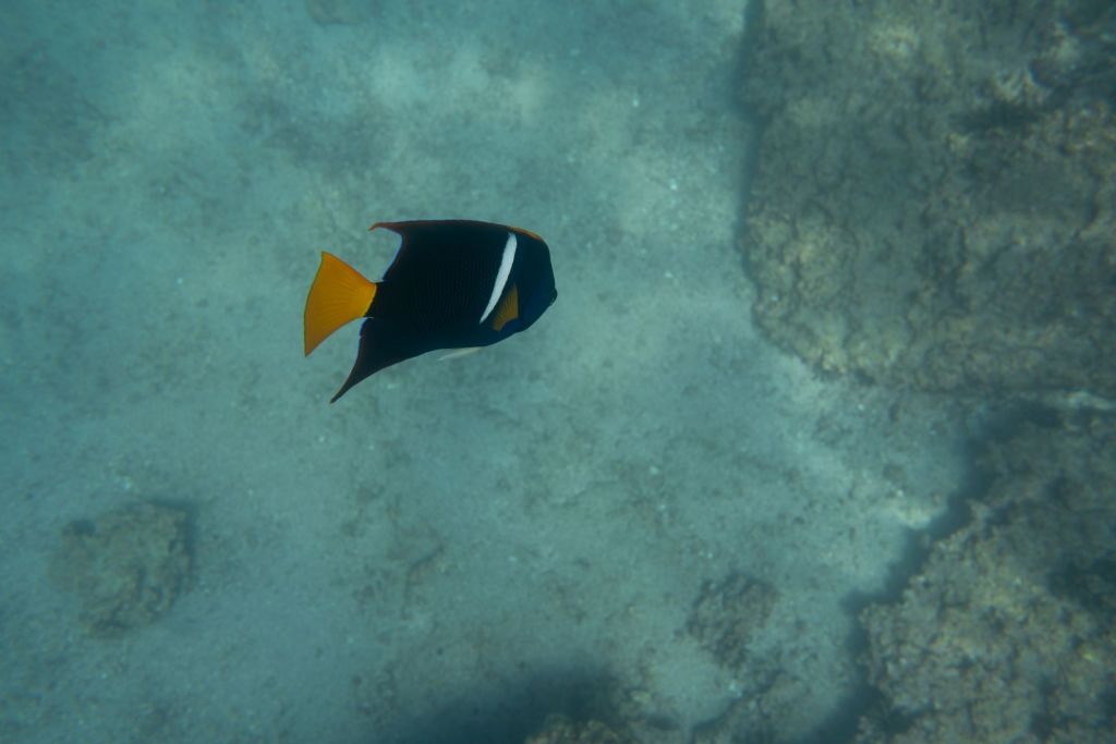 Zurück zu den Fischen. Wir sehen welche, mit gelbe Flossenspitzen und eine gelbe, über Rückenflosse und Bauchflosse verlaufende Linie haben. Sie sind sonst komplett schwarz mit einem weißen Streifen hinter den Kiemen. Diese Fische heißen Galápagos-Kaiserfische. Das sind die absolut Schönsten von allen.