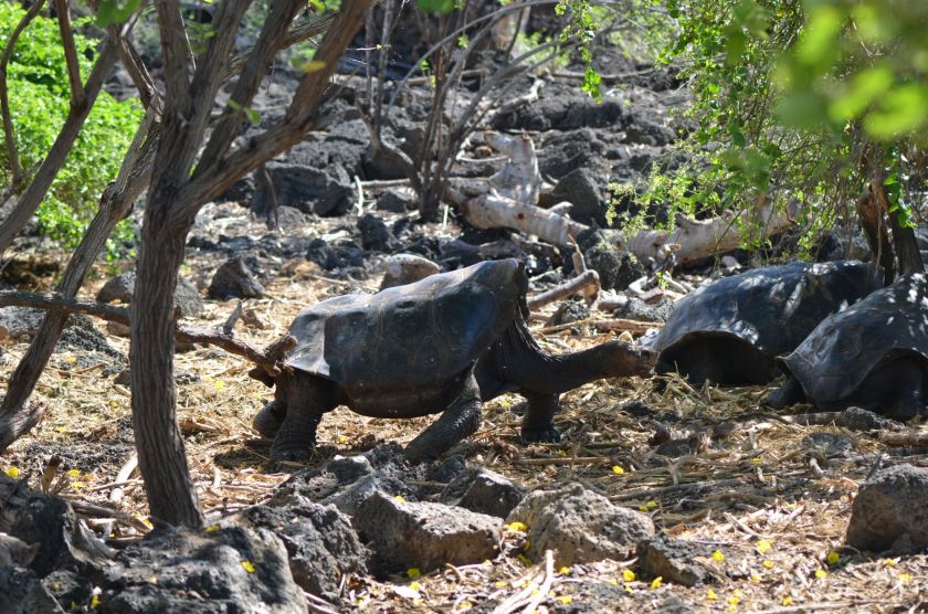 Die Geschichte der Galápagos- Riesenschildkröten ist wirklich traurig. Schätzungen zufolge liefen früher bestimmt 200.000 davon über die Inseln. Bei Gründung des Nationalparks waren es kaum mehr 15.000. Ihre Genügsamkeit wurde ihr Verhängnis. Seefahrer fanden heraus, dass man sie einfach unter Deck stapeln kann. Dann verfallen sie in eine Ruhe und brauchen über ein Jahr lang weder Futter noch Wasser. Dazu schmecken sie auch noch gut. Folgerichtig kamen Piraten, Walfänger und alles, was sonst noch auf Schiffen unterwegs war zum „tortoising“. In der Hochzeit der Walfänger zwischen 1800 und 1860 fuhr praktisch kein Schiff mit weniger als 100 frisch eingesammelten Schildkröten in der Vorratskammer weiter. Der Wahnsinn wurde in Logbüchern festgehalten. Da steht „in sechs Tagen 250 Tiere gesammelt“ oder „in neun Tagen 300 Tiere geladen“ oder auch mal etwas von 850 Tieren! Da grenzt es fast schon an ein Wunder, dass überhaupt welche überlebt haben.