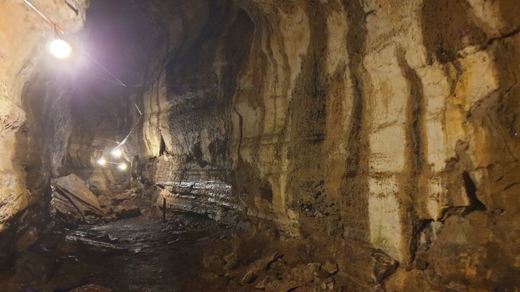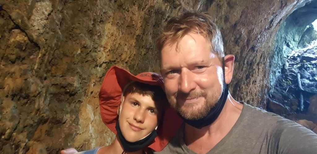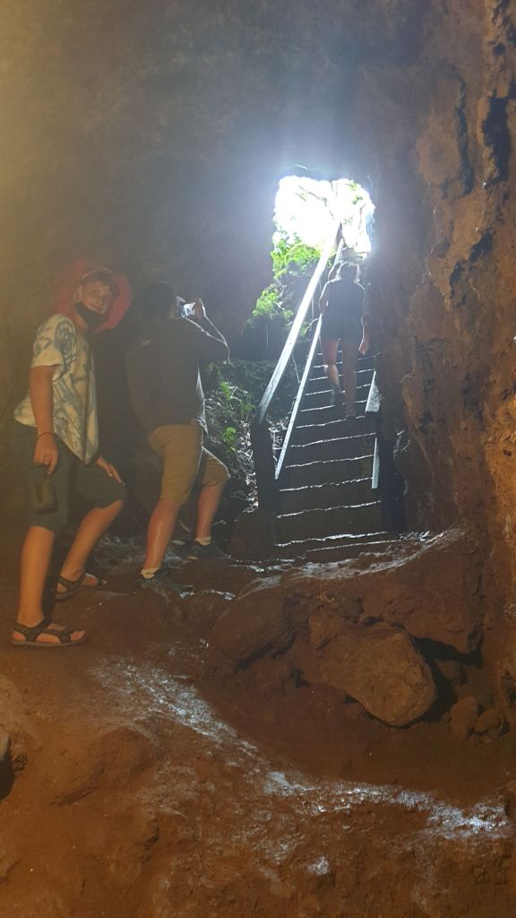 Auf dem Rückweg besuchen wir noch einen Lavatunnel. Auch dieser gehört zur Ranch, hat sogar eine notdürftige Beleuchtung bekommen. Der etwa 400m lange Spaziergang unter der Erde ist feucht. Nach dem gerade abgeklungenen Regenschauer tropft es durch das poröse Vulkangestein. Und dann ist da auch noch diese flache Stelle. Selbst unsere Kleinste muss sich hier noch kleiner machen. Doch letztlich schafft es sogar der Skipper darunter hindurch.
